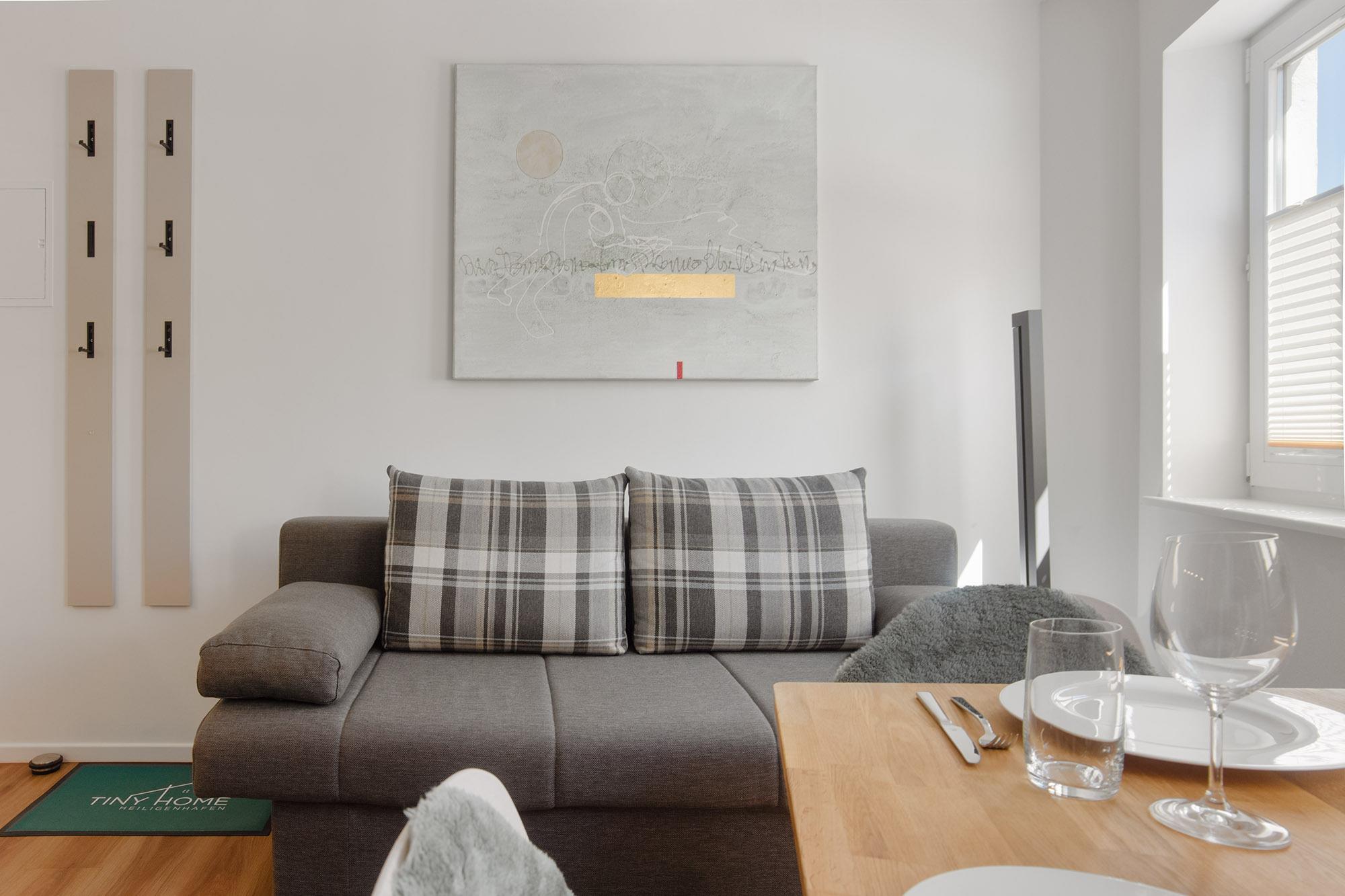 TinyHome ist liebevoll und hochwertig eingerichtet. An den Wänden hängen Originalwerke. Beschriftete Strand-, Seefahrts- und Meeresutensilien suchen Sie hier vergebens.