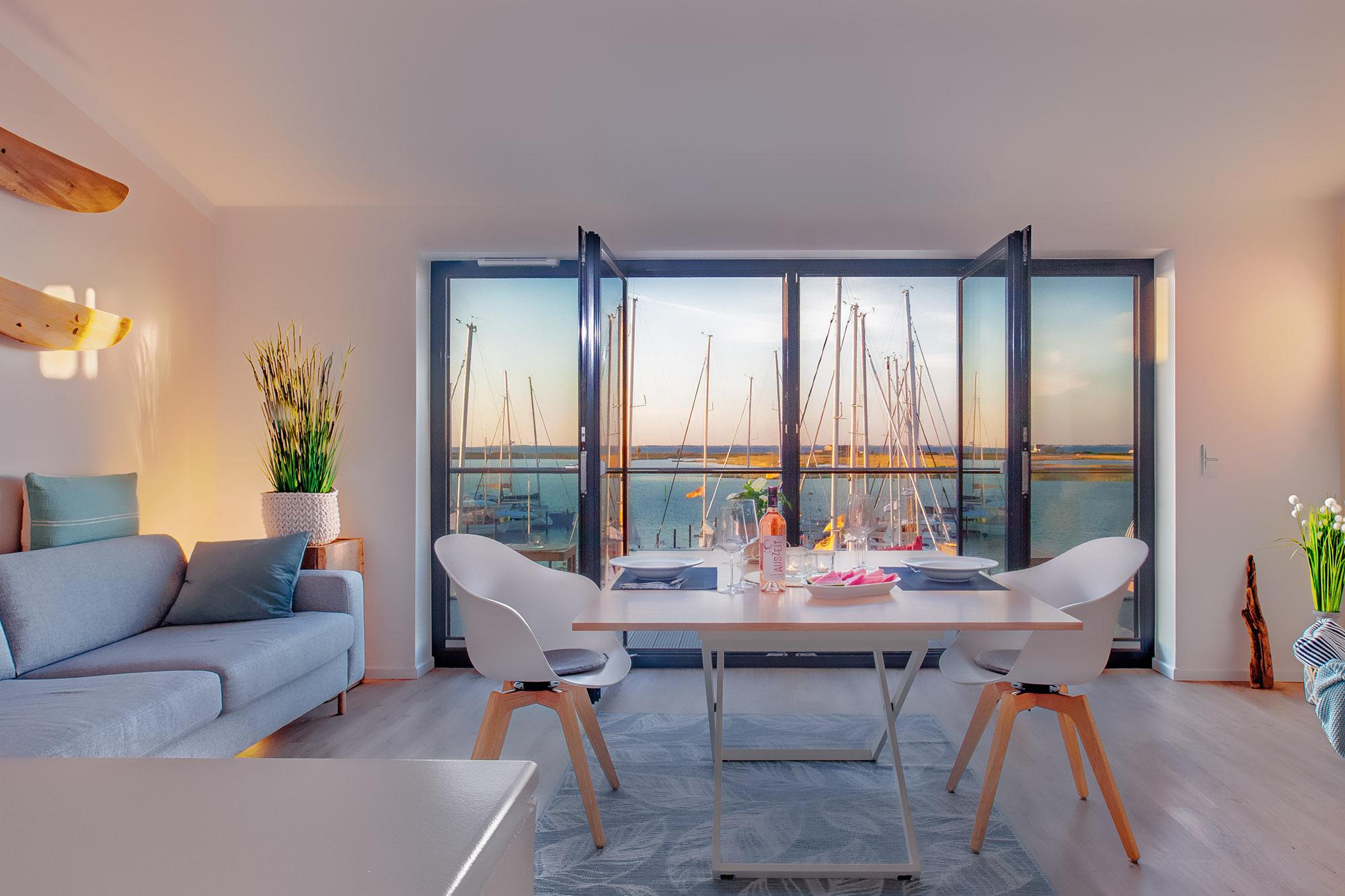Genießen Sie das maritime Flair Heiligenhafens in der exklusiven Maisonette-Ferienwohnung „Yachtenkieker“, die sich über zwei Ebenen und rund 92 m² erstreckt. Verbunden durch eine stilvolle Innentreppe, bietet dieses moderne Domizil im 1. Obergeschoss und Dachgeschoss einen atemberaubenden Panoramablick auf den Jachthafen und die Ostsee. Hier beobachten Sie Yachten, die sanft im Wasser schaukeln, und lassen den Alltag hinter sich – näher am Wasser kann man nicht Urlaub machen!