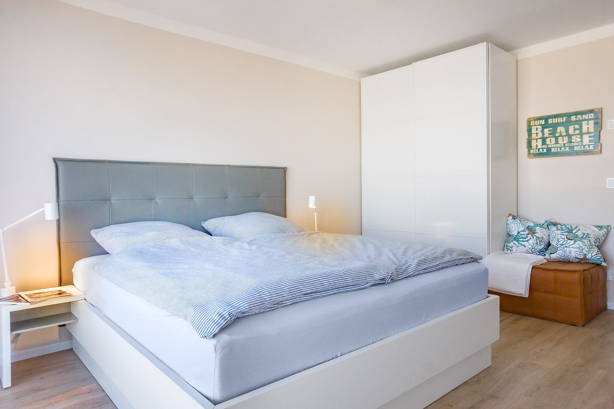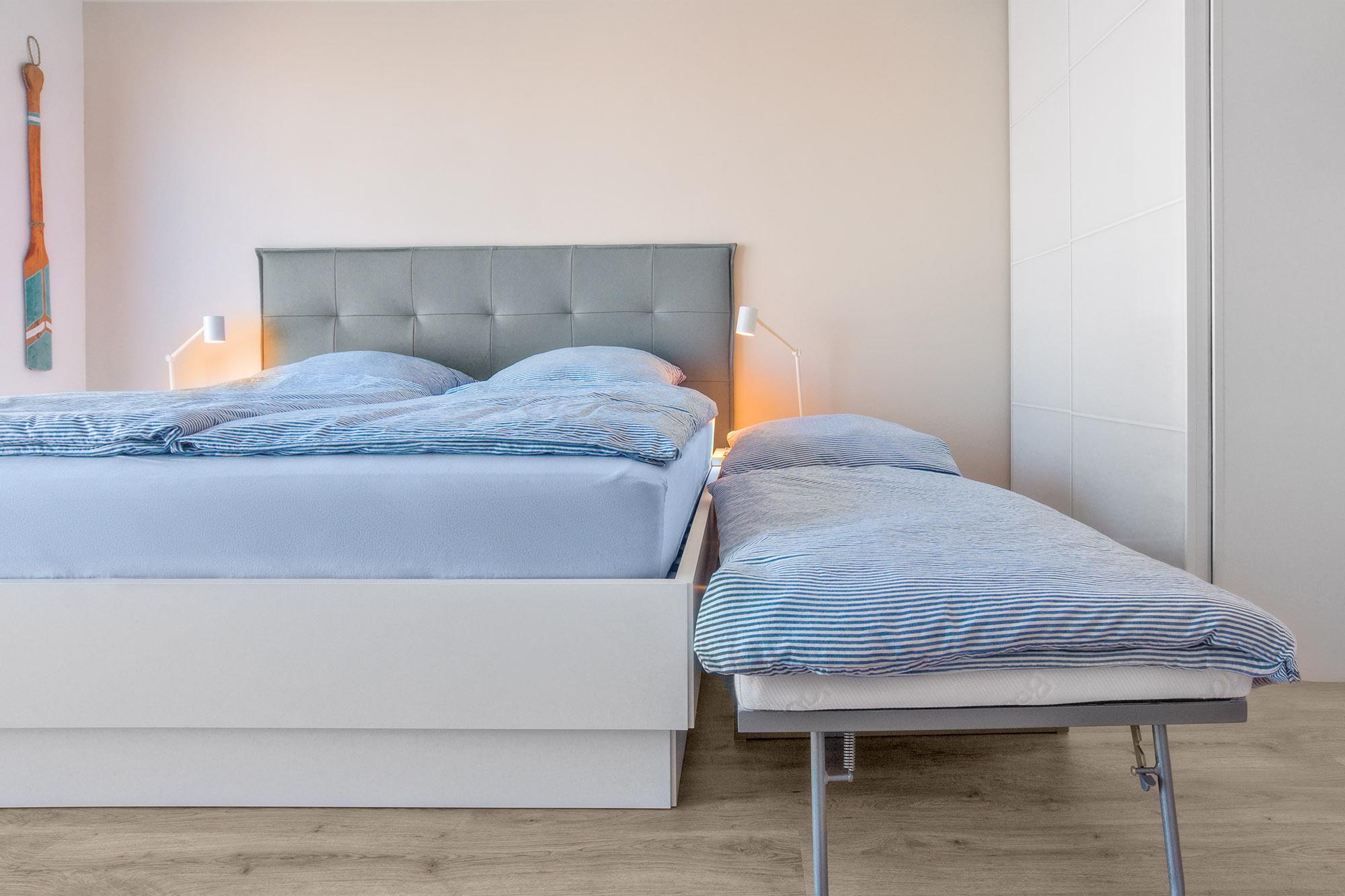 Die stilvolle Ferienwohnung bietet Platz für bis zu vier Personen. Das separate Schlafzimmer im ersten Obergeschoss ist mit einem modernen Doppelboxspringbett und einem wandelbaren Schlafhocker ausgestattet. Im großzügigen Wohnbereich lädt eine komfortable Schlafcouch (160x200 cm) zum Entspannen ein. Die hochwertige Ausstattung mit Smart-TV, WLAN, Playstation, Bluetooth-Soundbox und einer kleinen Bibliothek lässt in puncto Unterhaltung keine Wünsche offen.