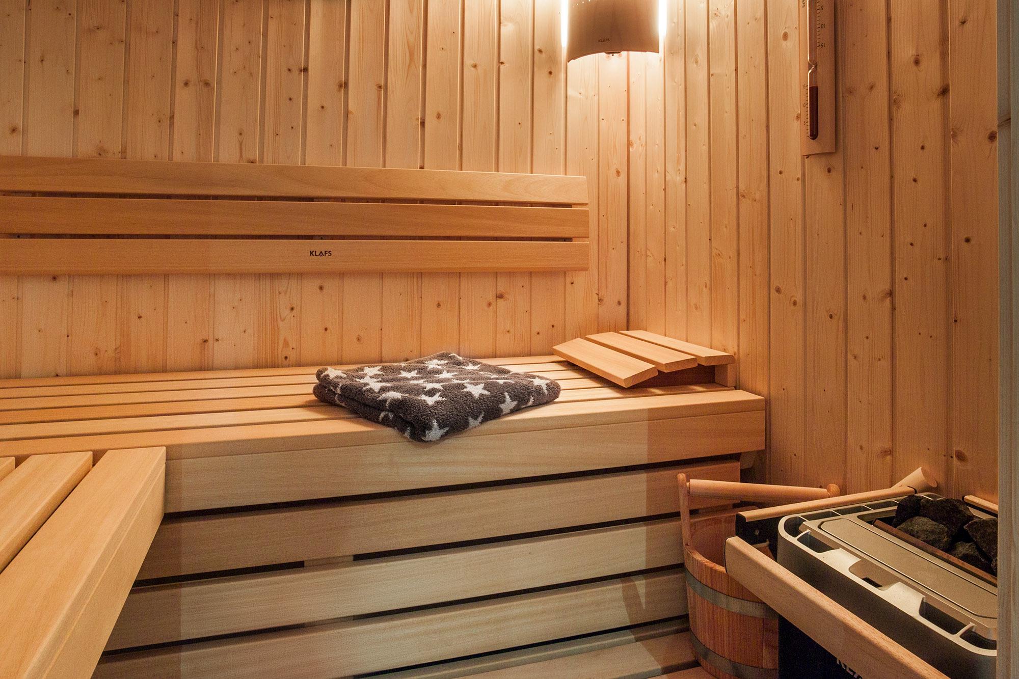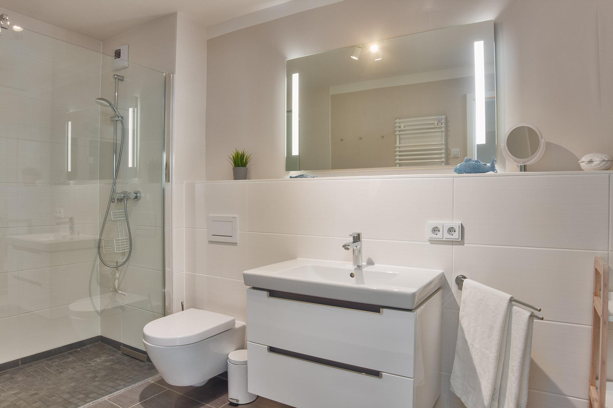 Nach einem aktiven Tag an der Ostsee bietet das luxuriöse Badezimmer mit ebenerdiger Dusche und integrierter Sauna wohltuende Entspannung. Zusätzlich stehen eine Waschmaschine und ein Trockner in einem separaten Raum zur Verfügung.