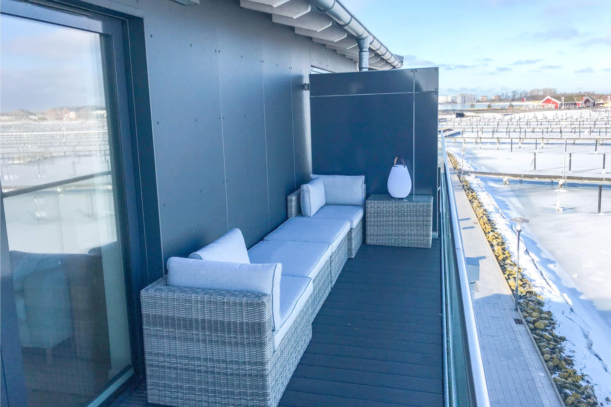 Ein weiteres Highlight sind die beiden möblierten Dachterrassen. Tagsüber genießen Sie auf der sonnigen Südterrasse die frische Meeresbrise, während die Nordterrasse in den Abendstunden zum perfekten Ort für ein Glas Wein bei traumhaftem Sonnenuntergang wird.