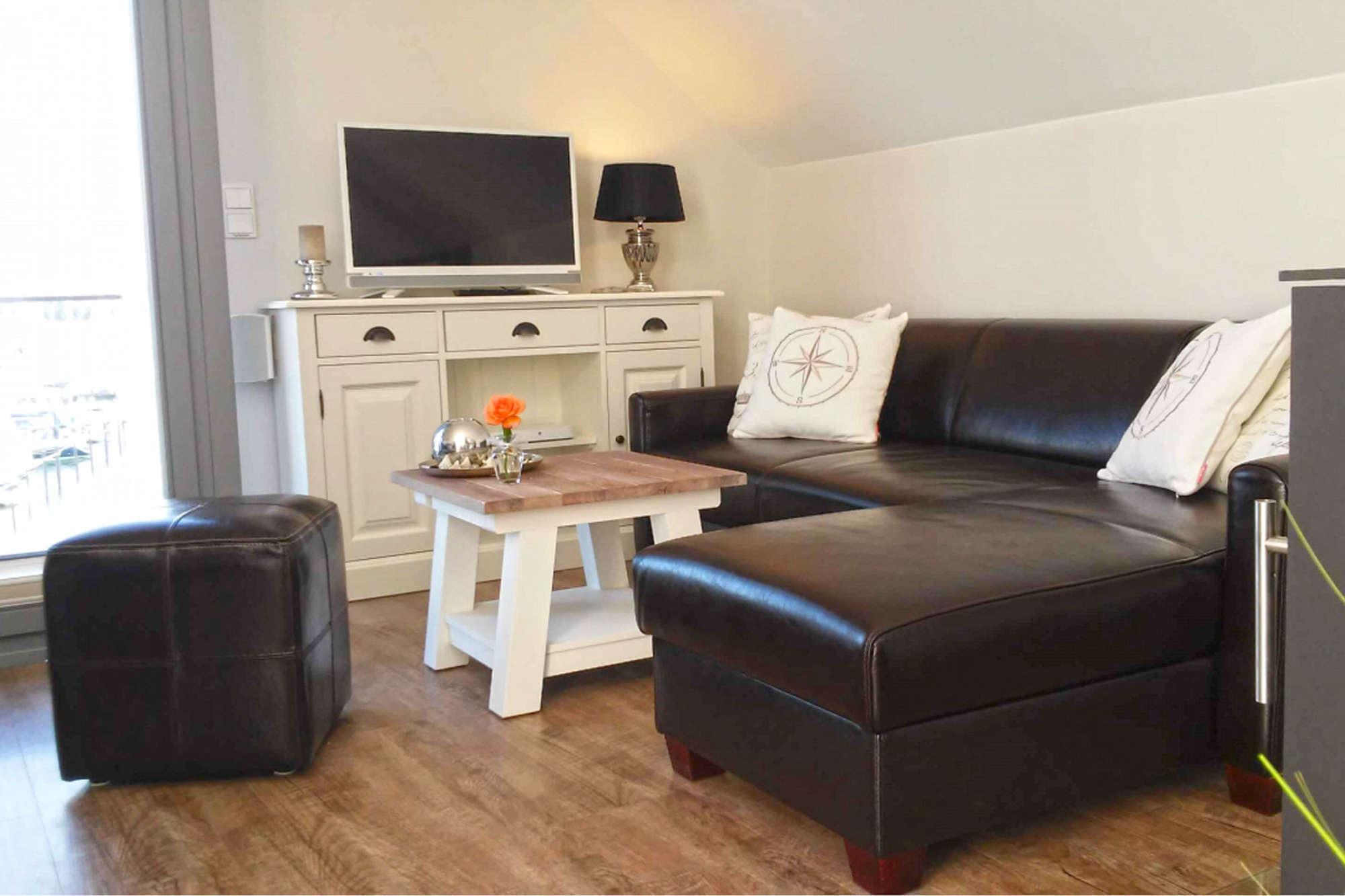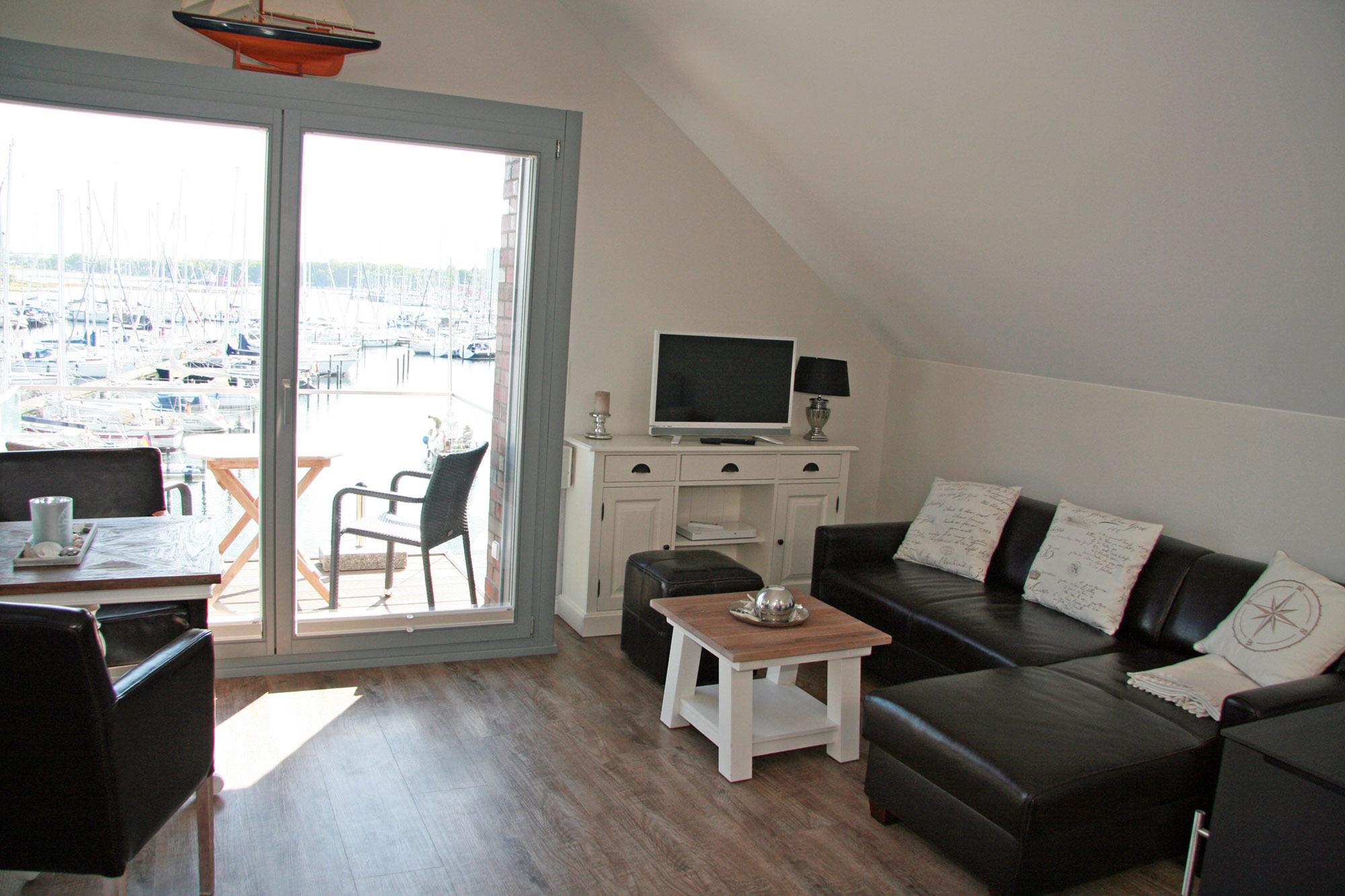 Die komfortable Ferienwohnung für 2 Erwachsene ist auf ca. 42 m² mit modernen und hochwertigen Möbeln für den gehobenen Anspruch eingerichtet. Zeitgemäße Annehmlichkeiten mit WLAN, TV, Radio, CD/Blue-Ray-Player und 2. TV im Schlafzimmer sind selbstverständlich. Die gesamte Wohnung ist mit Qualitätsboden ausgestattet. An kälteren Tagen oder bei Bedarf sorgt der Kaminofen (ohne Holzvorrat) für Behaglichkeit. So verbringen Sie hier zu jeder Jahreszeit einen erholsamen Urlaub. Genießen Sie den hellen Wohnbereich mit bodentiefen Fenstern und dem fantastischen Blick über den Jachthafen und in der Ferne die Ostsee mit der Fehmarn-Sund-Brücke. Die Leder-Couch und Beistellsessel sorgen dabei für bequemes Relaxen. Die offene, sehr gut ausgestattete Küche ist bei Bedarf mit den notwendigen Extras versehen, um den gehobenen Ansprüchen zu entsprechen. Damit steht der kulinarischen Abrundung Ihres Aufenthaltes nichts im Wege. Vom Essbereich oder dem kleinen möblierten Balkon mit Sonnenschirm lassen Sie dann Ihren Blick beim Essen in die Ferne schweifen. Hier erleben Sie wirklichen "Yachthafenblick" und genießen die Ostsee, eine gute Tasse Kaffee oder ein kühles Glas Wein. Für die nächtliche Ruhe steht Ihnen ein Schlafzimmer mit Doppelbett mit Einzelmatratzen zur Verfügung. Hotel-Bettwäsche und Handtücher sind Allergiker geeignet und gg. Gebühr möglich. Das Badezimmer bietet ebenfalls mit Handtuchwärmer und Regen-Dusche weitere Entspannung nach einem ereignisreichen Tag. Fahrräder sind gegen Gebühr beim örtlichen Verleih am Beach Motel möglich. Die Ferienwohnung erreichen Sie bequem von Ihrem Pkw-Stellplatz. Zugang zur Wohnung über Treppe. Die Wohnung ist ein Nichtraucher-Objekt! Haustiere sind nicht erlaubt! Ofen Holz gehört nicht zum Angebot!