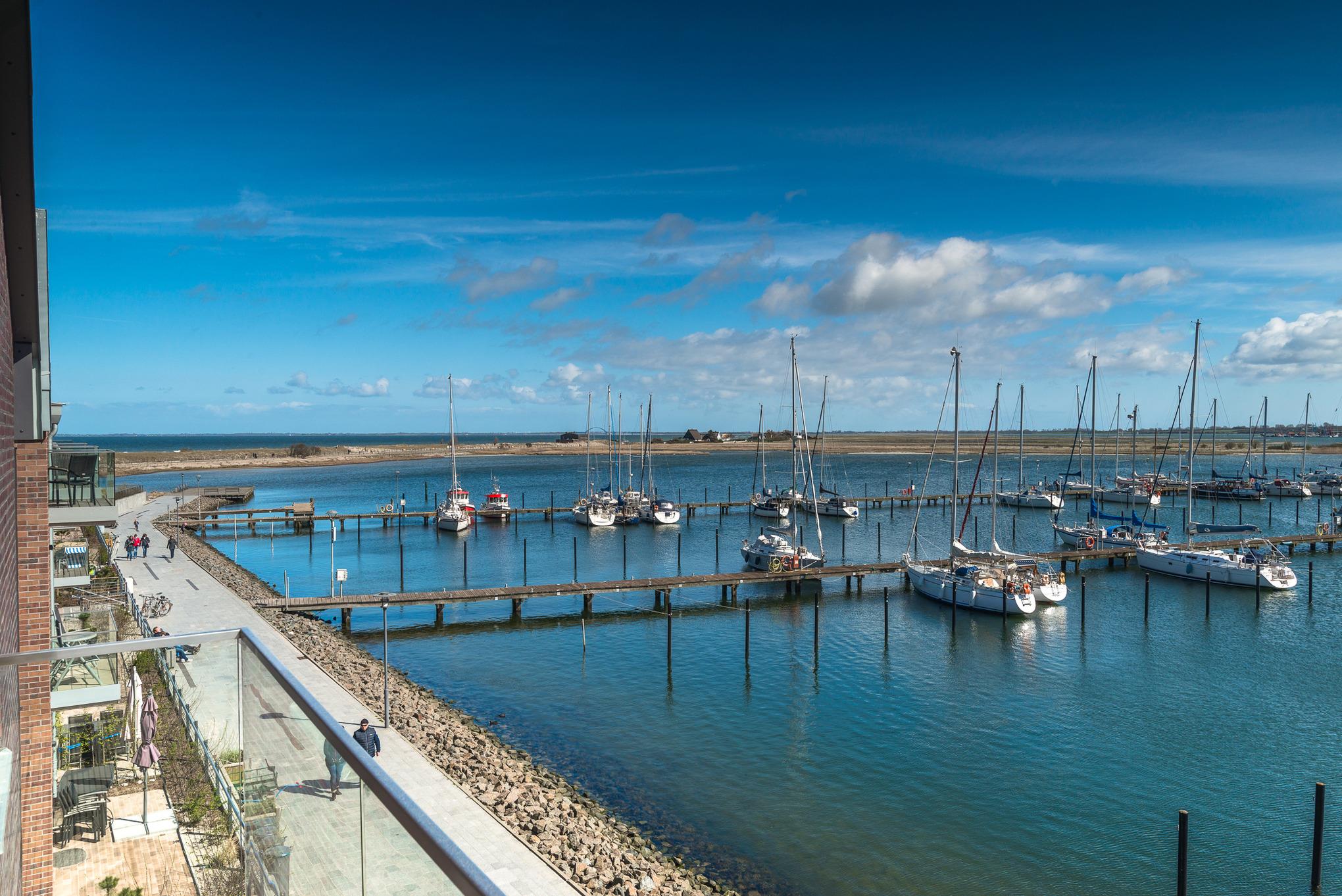 Lassen Sie Ihren Blick über den Jachthafen, den Binnensee, das Meer und bishin zur Fehmarnsundbrücke schweifen.