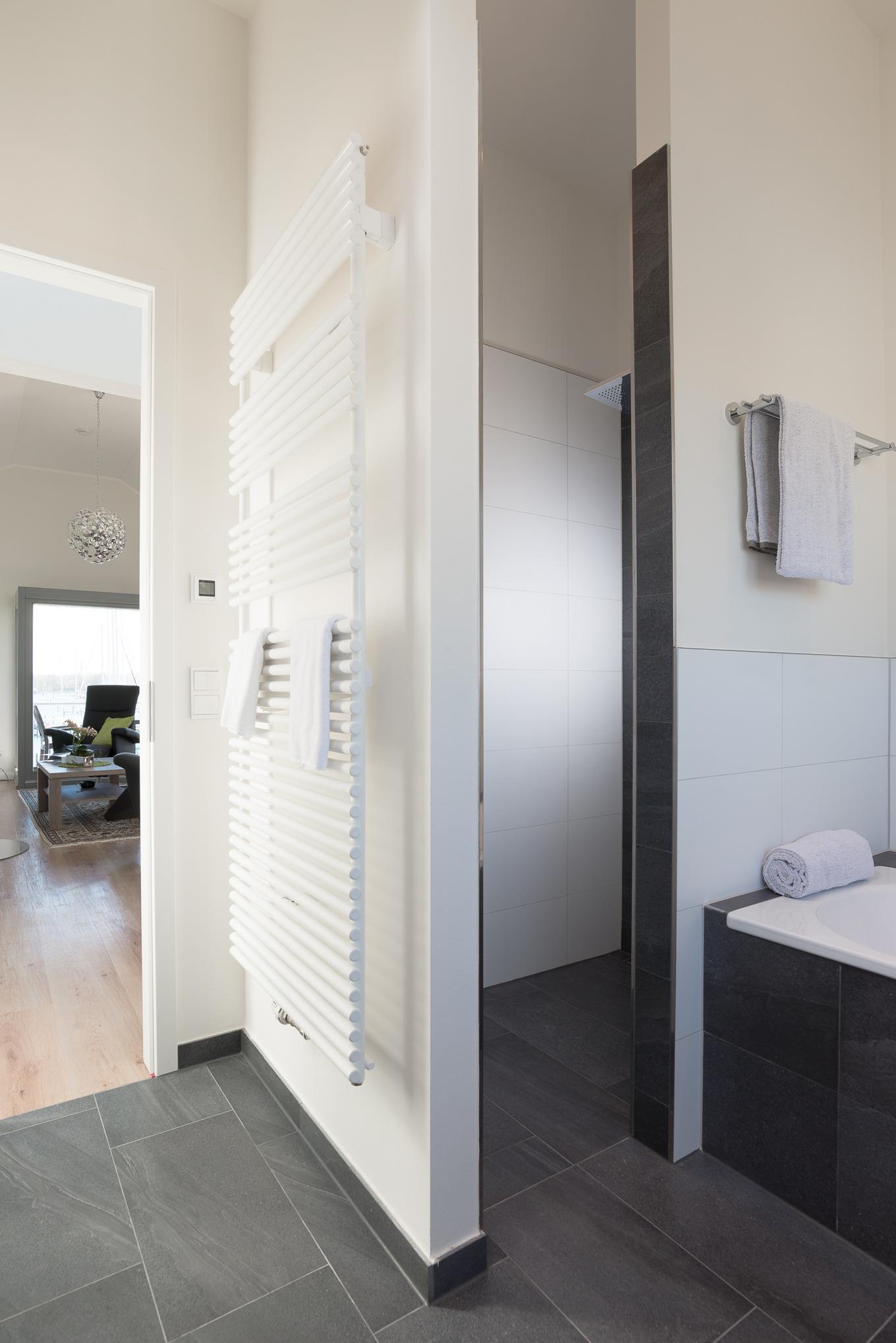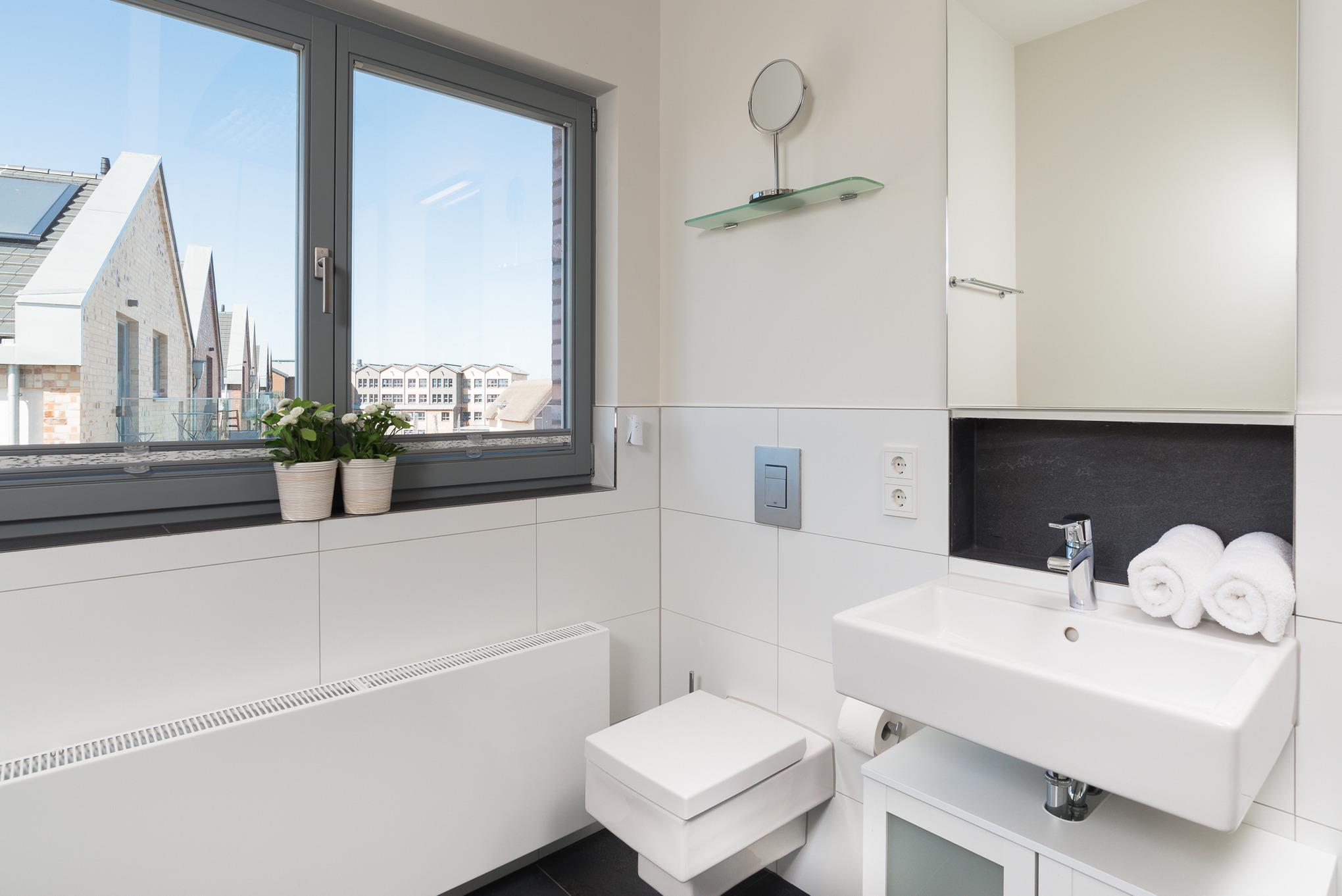 Ein geräumiges Bad mit WC, Dusche und Badewanne runden die Ferienwohnung ab.