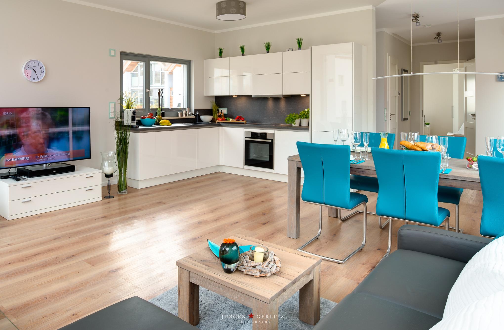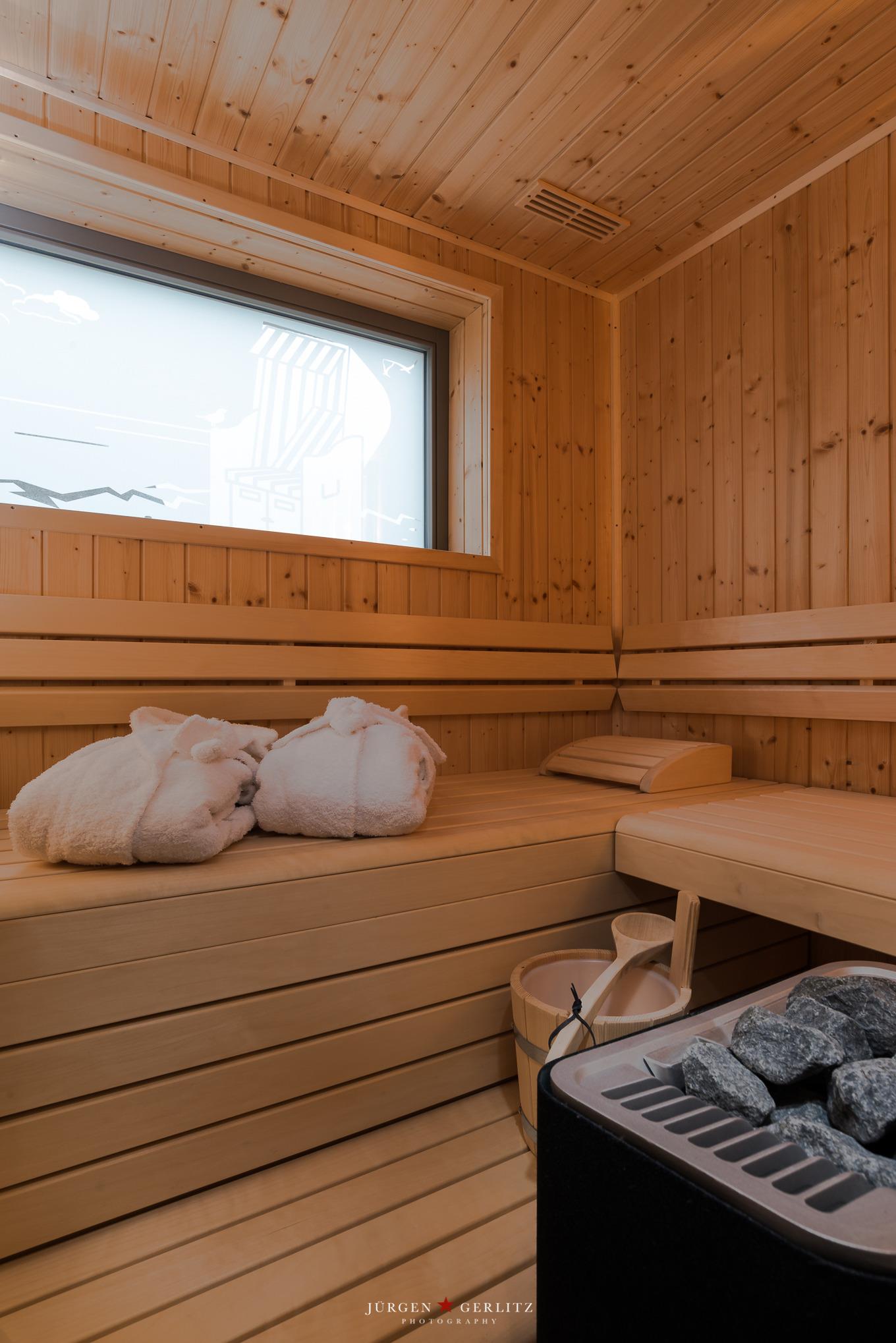 Ein Highlight des Einzelhauses ist der luxuriöse Wohnbereich mit offener Küche und Panoramablick. Hier kann man wirklich von in einer "Wohnlandschaft" sprechen. Der in Erdtönen und mit hochwertigen Materialien gestaltete Raum verschmilzt mit dem Meer und den Dünen, die sich vor der bodentiefen Glasfront erstrecken. In der mit Ceranherd, Kühlschrank, Backofen und Spülmaschine ausgestatteten Qualitätsküche lassen sich auch größere Menüs zaubern. Vor dem Essen ein paar Gänge in der hauseigenen Sauna, anschließend ein Glas Wein vor dem flackernden Feuer des Kamins, während draußen die Ostsee ihr Nachtlied singt. So wurde hier auf ca. 137 qm Wohnfläche, verteilt auf Erdgeschoss und Dachgeschoss, die Idee vom perfekten Ferienhaus am Meer verwirklicht. Hier dürften die Ferien nie zu Ende gehen!