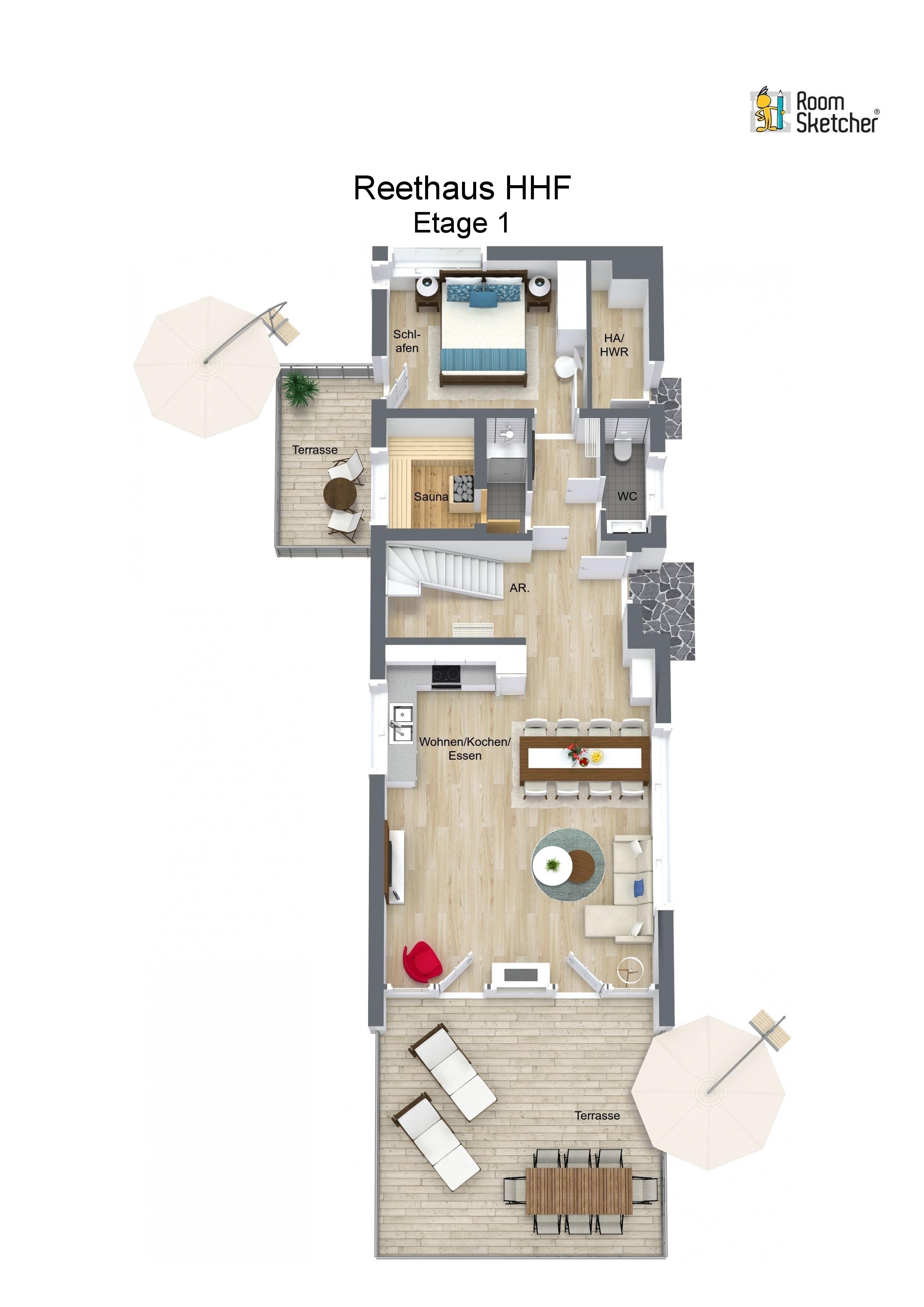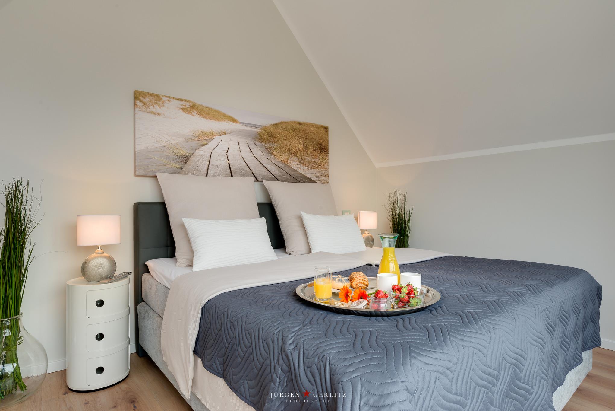 Ein Domizil für Feriengäste mit Faible fürs Besondere. Die vollverglaste Giebelseite und die schönen Holzterrassen sind für die Reetdachhäuser schon von weitem ein Blickfang inmitten der eigens angelegten Dünenlandschaft. Der äußere Eindruck weckt Erwartungen, die innen noch übertroffen werden. Die behaglichen Räume im Erdgeschoss und im ausgebauten Dachgeschoss strahlen Charme und Luxus aus. Aus den Wohn- und Schlafräumen genießt man einen Blick auf den Yachthafen und die Dünenlandschaft.