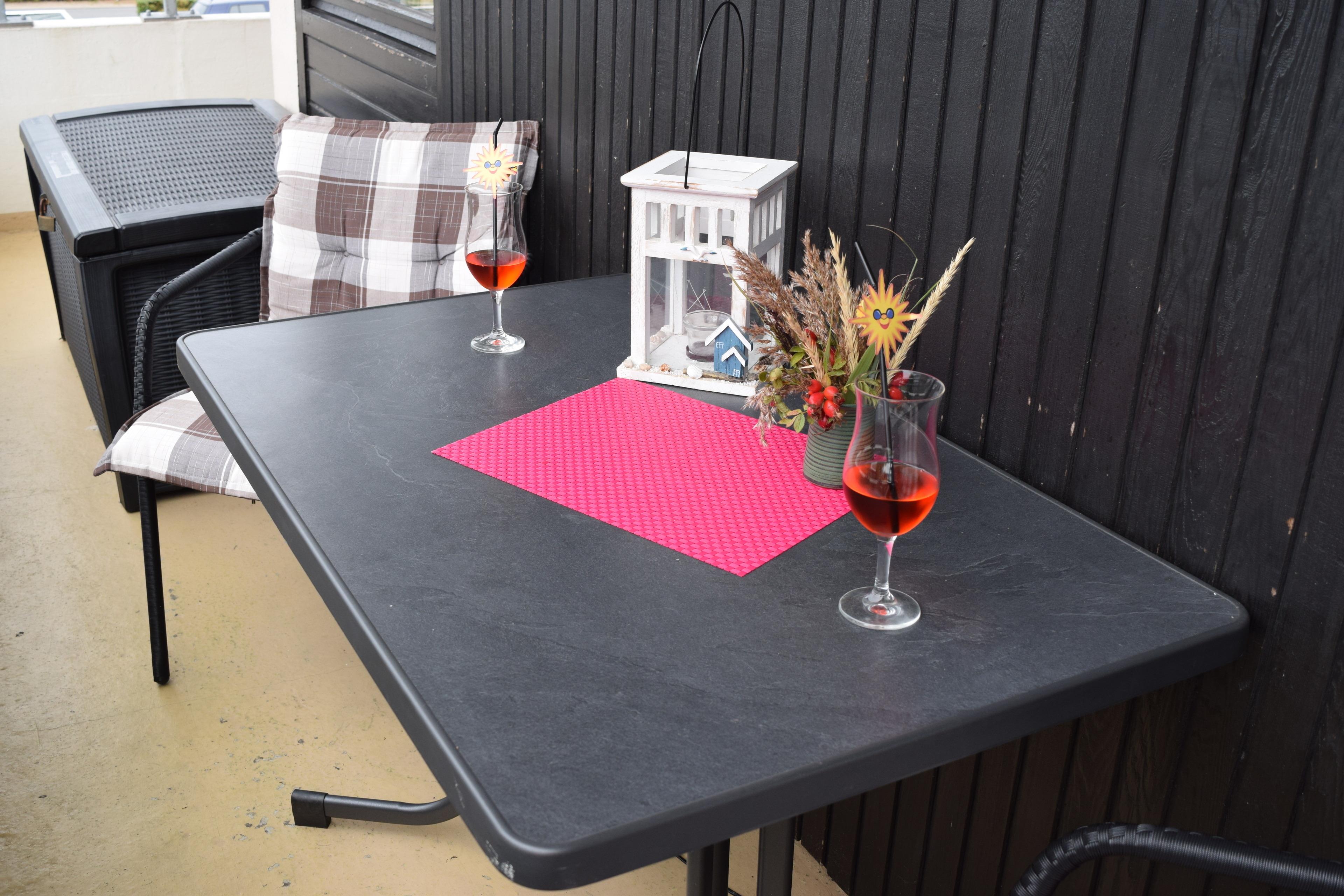 Die separate Essecke bietet einen gemütlichen Platz für gemeinsame Mahlzeiten. Die kleine Einbauküche ist bestens ausgestattet mit einem 2-Platten-Herd, einem neuen Kühlschrank mit 3*-Gefrierfach, einer Mikrowelle sowie einem Wasserkocher, Toaster und einer Kaffeemaschine.