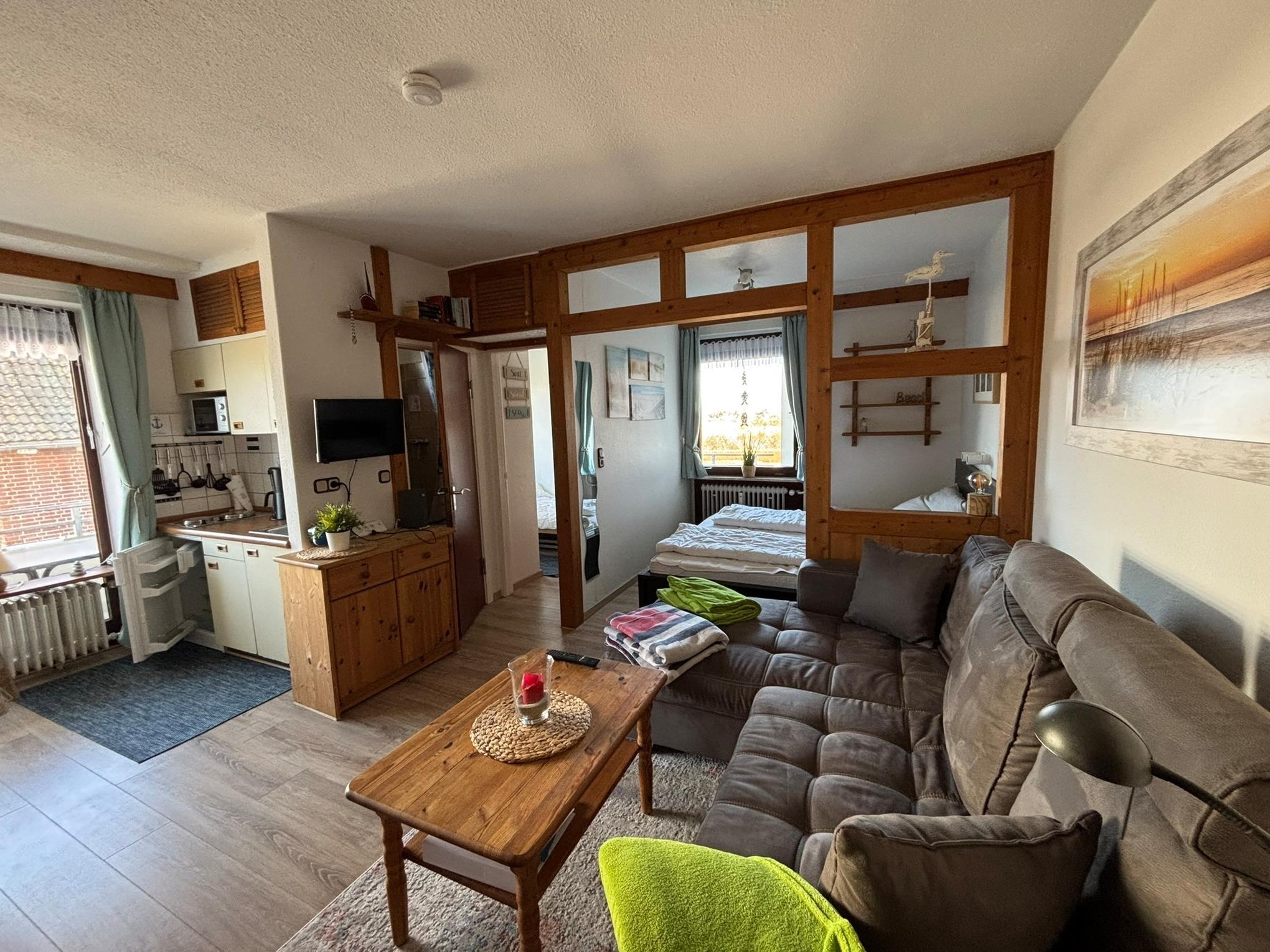 Die Wohnung ist 35 m² groß und bietet alles, was Sie für einen entspannten Urlaub benötigen. Sie verfügt über einen kombinierten Wohn- und Schlafraum mit einem komfortablen Doppelbett sowie ein separates, kleines Schlafzimmer mit einem Einzelbett. Der Laminatboden sorgt für eine angenehme Atmosphäre. Im Wohnbereich lädt eine gemütliche Ledersitzecke zum Verweilen ein, und ein Flachbildfernseher mit DVD-Player sorgt für Unterhaltung.