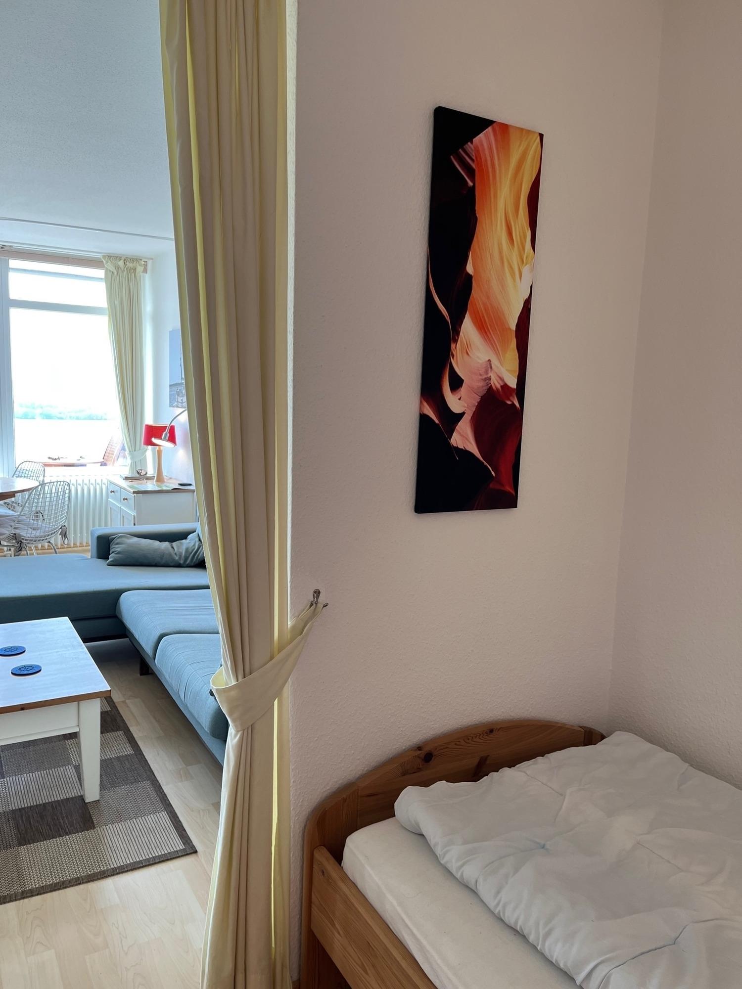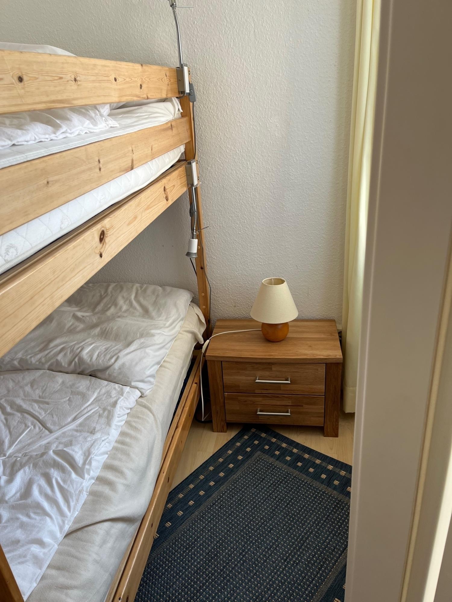Die 45 qm Wohnung befindet sich im Ferienpark im Block L in der 10. Etage. Das Gebäude besitzt einen Fahrstuhl. Aus der Wohnung und vom Balkon haben Sie einen herrlichen Panoramablick Richtung Steilküste und Ostsee. Die helle, modern eingerichtete Wohnung ist mit einem Laminatfußboden ausgelegt. Es befindet sich eine offene Küche in der Wohnung, die an den Wohn-Schlafraum grenzt. Die Küche ist mit einem Backofen, 4-Plattenherd und einer Mikrowelle ausgestattet. Der Schlafbereich kann vom Wohnzimmer mit einem Vorhang abgetrennt werden und verfügt über zwei Einzelbetten. Im Wohnbereich lädt eine moderne Eckcouch zum Verweilen ein. Im Wohnbereich befindet sich ein TV, Radio und ein DVD-Player. Vom Wohnbereich gelangen Sie in das Kinderzimmer, welches über ein Etagenbett verfügt.