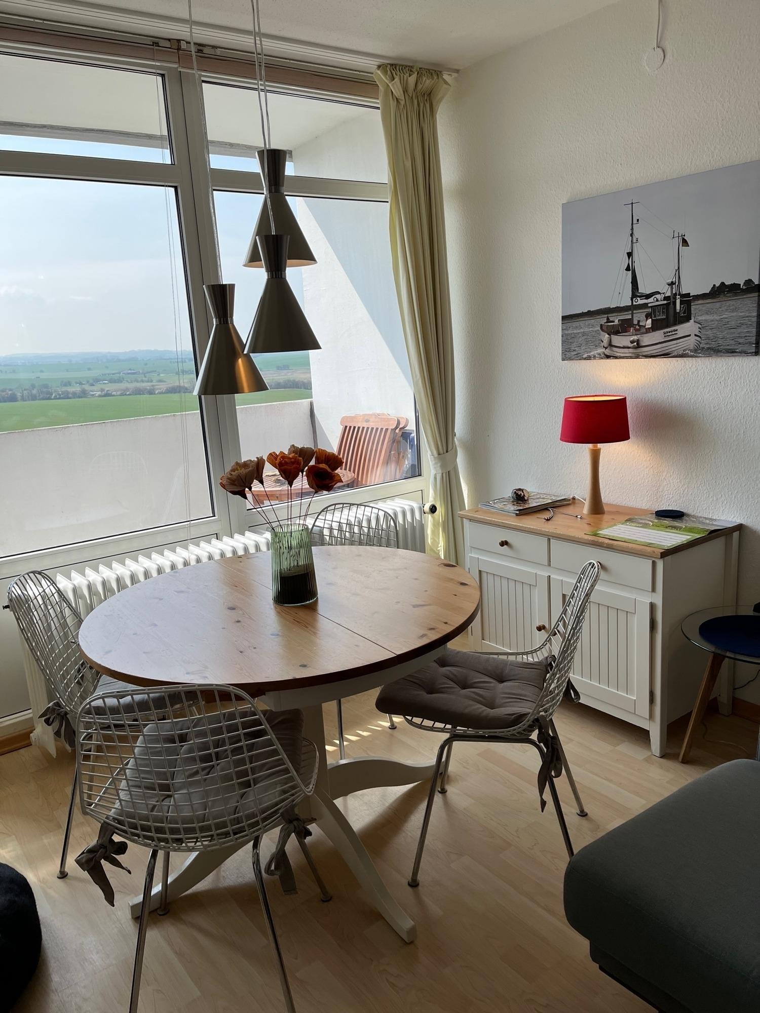 Es befindet sich ebenfalls eine kleine Essecke im Wohnbereich, an der man beim gemeinsamen Essen den Ausblick genießen kann. Das Badezimmer ist mit einer Dusche ausgestattet.