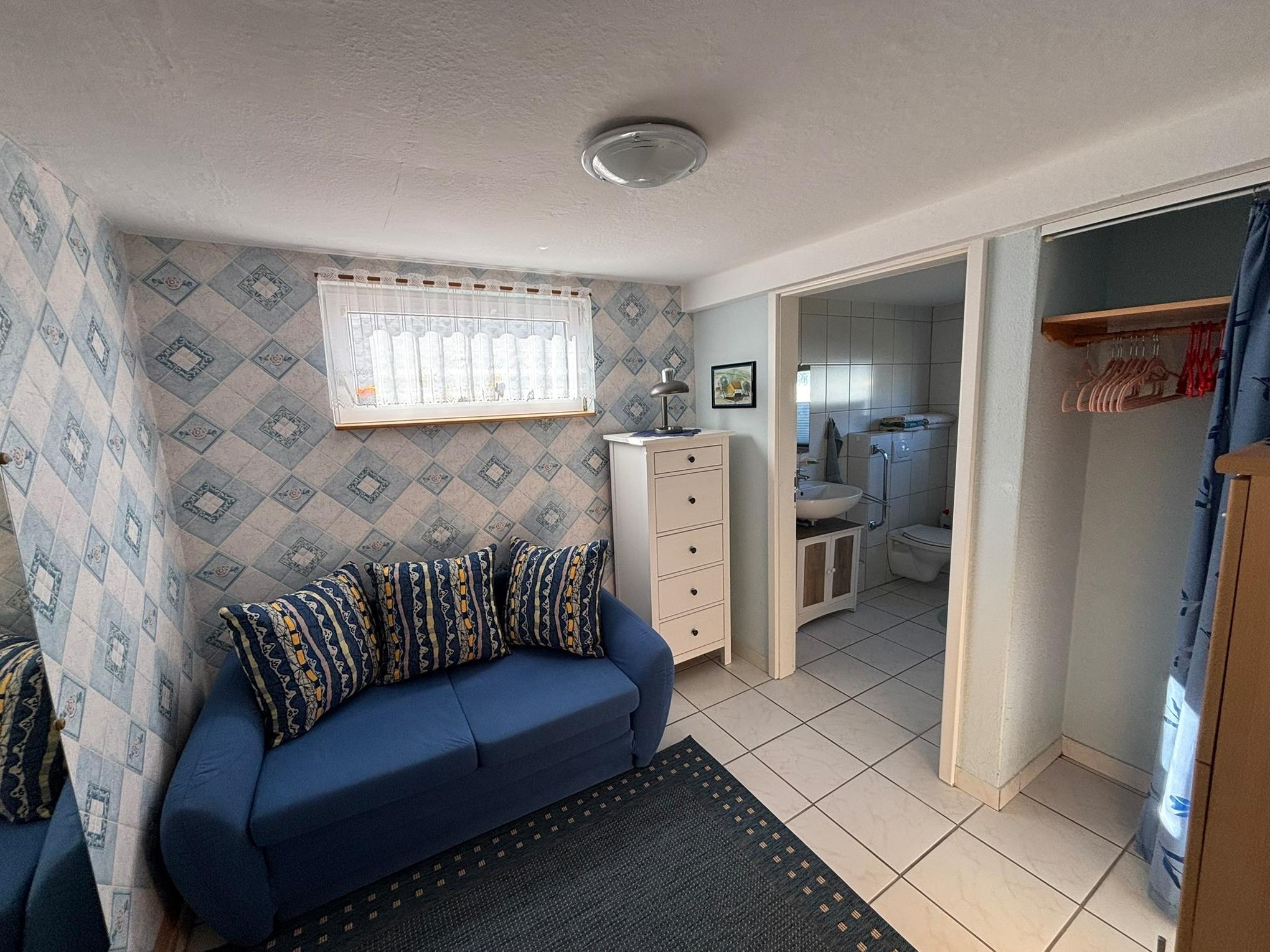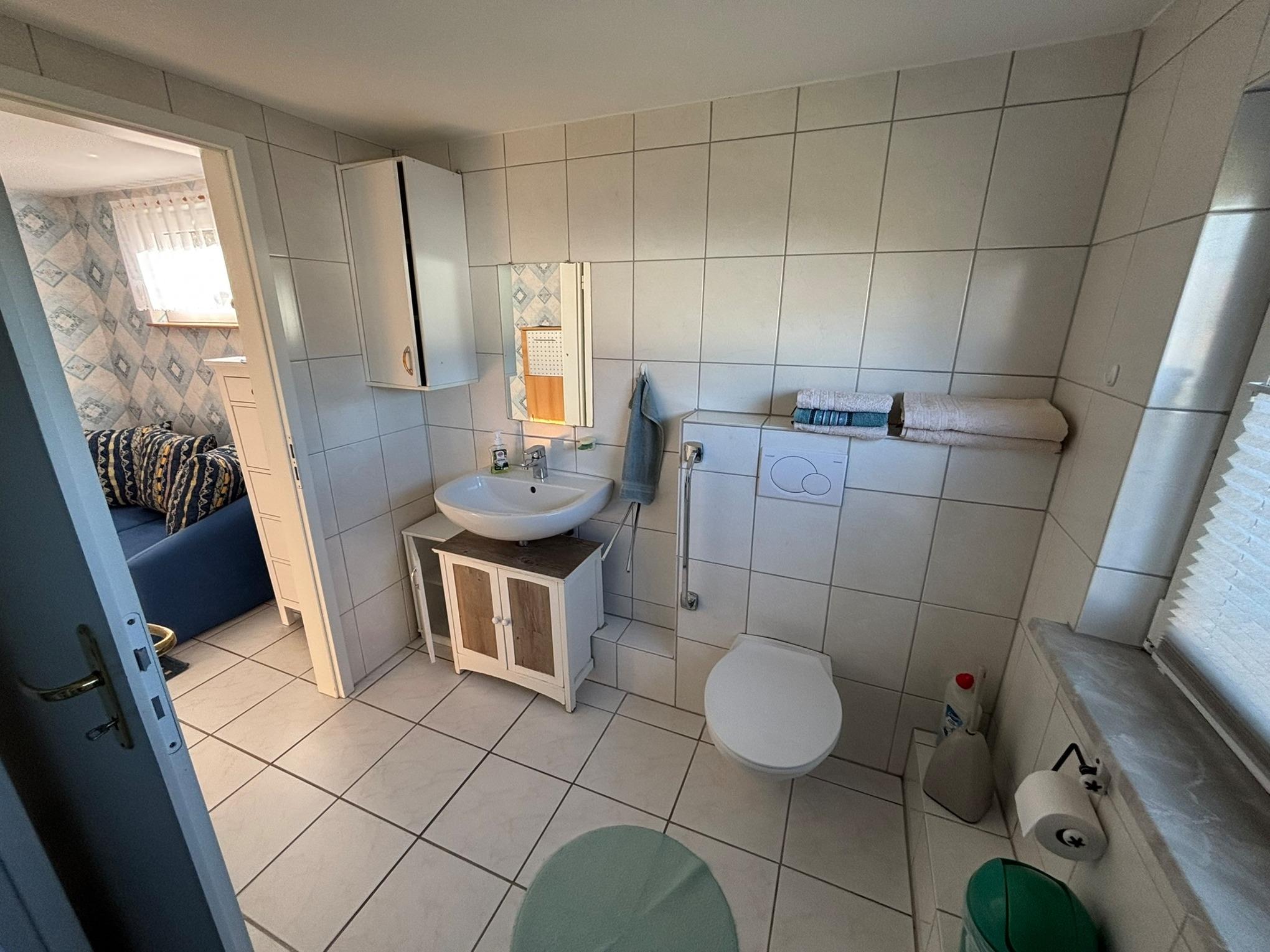Ferienwohnung, behindertengerecht, in Ortmühle, Ortsrand von Heiligenhafen, für Nichtraucher, Erdgeschoß, breite Türdurchgänge, 40qm, 1 Wohn- Schlafraum mit 2 hochwertigen Schlafcouchen, einzelnd oder zusammen stellbar, 1 Schlafraum für 1 Kind bis max. 5 Jahre mit Schlafcouch, TV, Radio, Eßecke, Terrasse mit Gartenmöbel, sep.Küchenzeile mit Mikrowellenbackofen, große Dusche ebenerdig mit Stuhl und Halterung, WC, Parkplatz vor Ort, Haustiere erlaubt, Bettwäsche, Handtücher,( Erstausstattung ), Endreinigung inkl. Freisitz im Garten mit Grillecke.