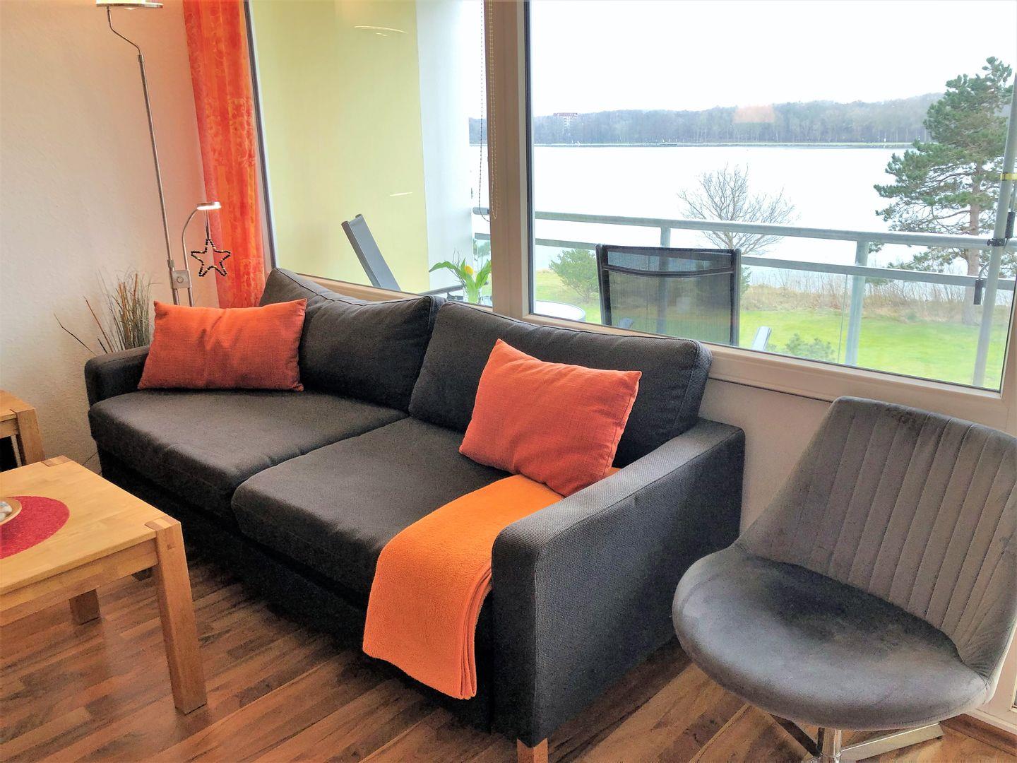 Der Wohnbereich ist mit einem Tresen-Esstisch für 4 Personen, einem kuscheligen, großen Sofa, einem gemütlichen Doppelbett (2* 80*200 cm) sowie einem 2-türigen Kleiderschrank ausgestattet. Zu Ihrer Unterhaltung steht ein 43“ Flachbildfernseher -Smart TV ist mit dem Internet gekoppelt und ermöglicht den Zugriff auf die Mediatheken der Sender, DVD-Player, Kompaktanlage (22 digitale Rundfunksender können glasklar empfangen werden), Bücher und das offene, kostenlose W-Lan-Netz des Hauses bereit.