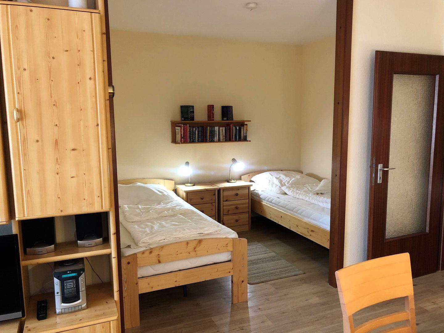 Sep. Schlafbereich mit 2 Standard-Einzelbetten. Außerdem ein sep. Kinderzimmer mit Etagenbett (1,80 m Länge).
