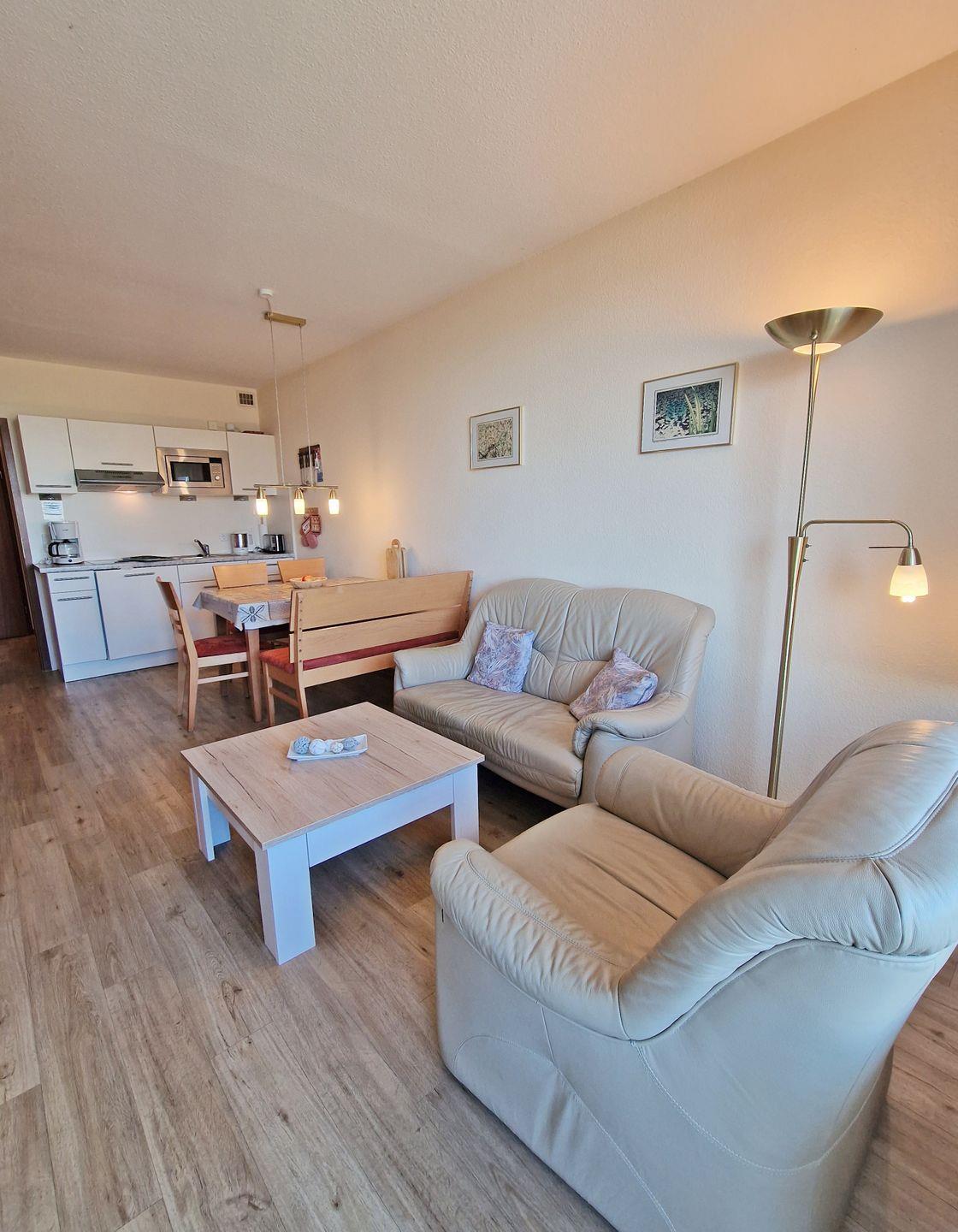 Wohnbereich mit einer 2er-Ledercouch und Sessel und LCD-TV. Direkt angeschlossen ist der Essbereich und integrierter Küche mit 4er Ceran-Kochfeld.