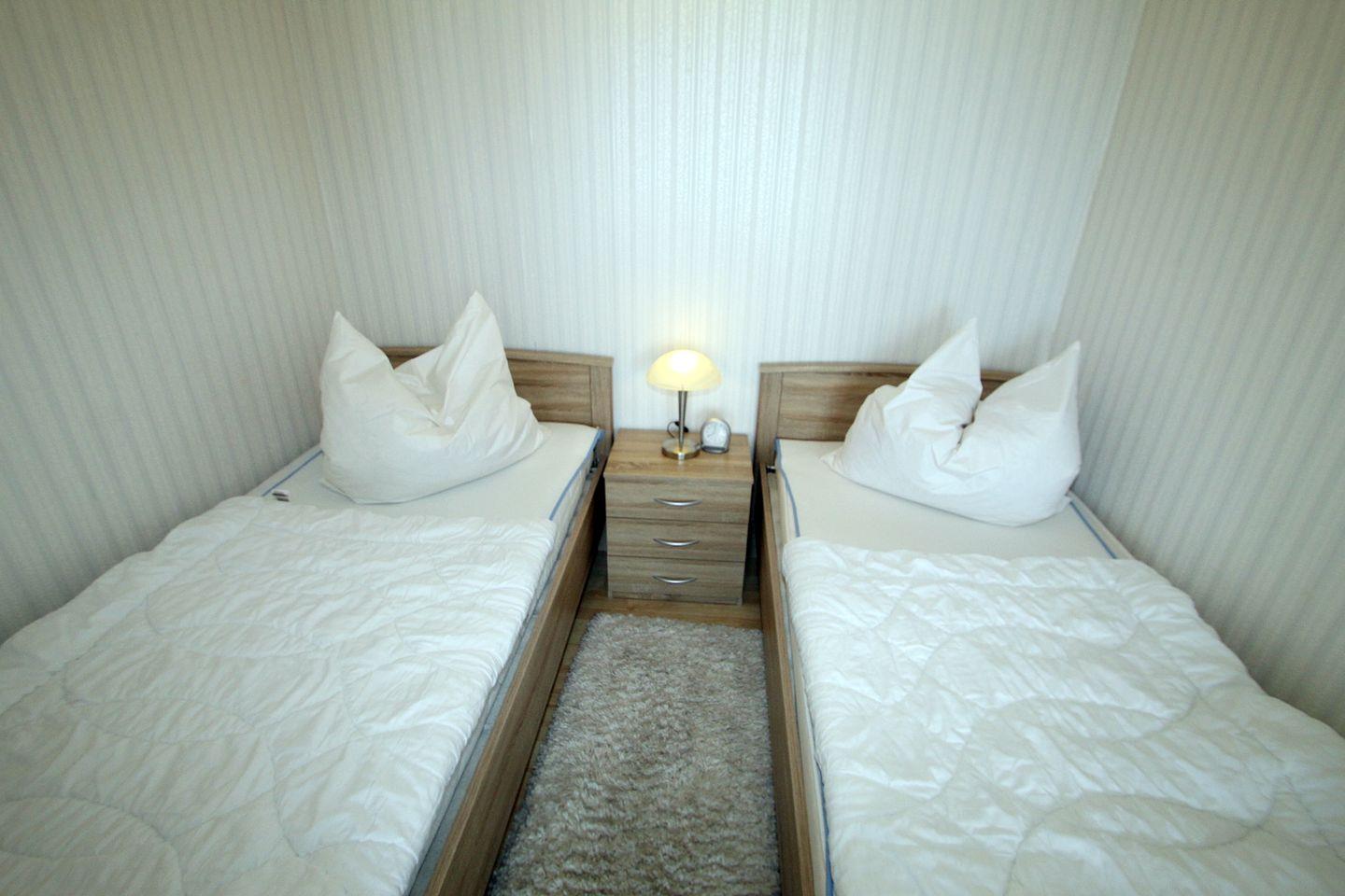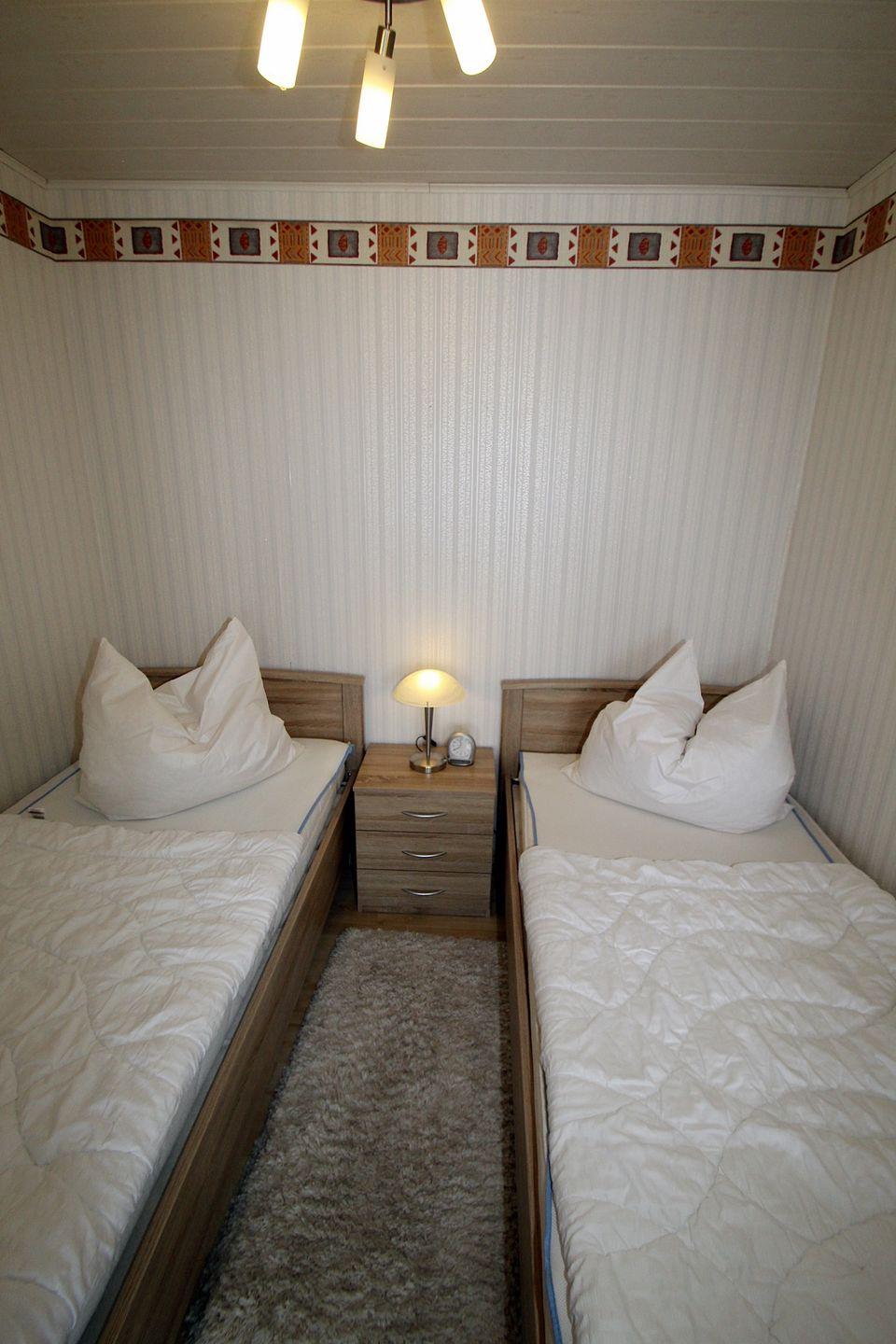 Der Schlafbereich ist durch einen Vorhang vom Wohnbereich abtrennbar und verfügt über zwei Standard-Einzelbetten und eine kleine Kommode.