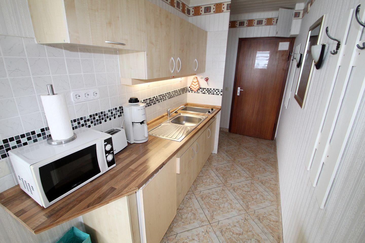 Die Küchenzeile ist mit den üblichen Utensilien ausgestattet. Kühlschrank mit Gefrierfach, Mikrowelle, kleines Cerankochfeld, Kaffemaschiene etc.