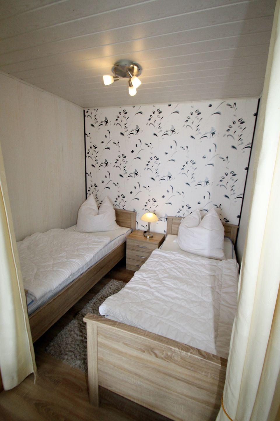 Der Schlafbereich ist durch einen Vorhang vom Wohnbereich abtrennbar und verfügt über zwei Standard-Einzelbetten und eine kleine Kommode.