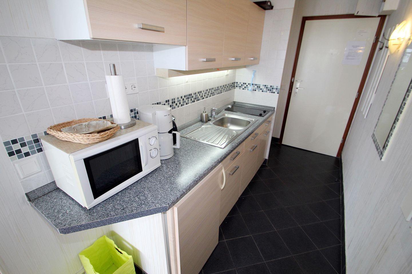 Die Küchenzeile ist mit den üblichen Utensilien ausgestattet. Kühlschrank, Mikrowelle, kleines Cerankochfeld, Kaffemaschiene etc.