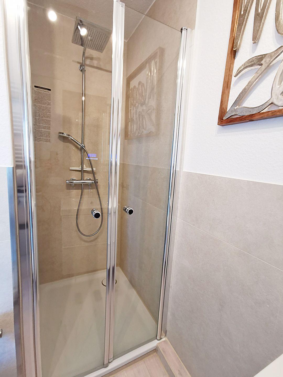 Dass innenliegende Duschbad verfügt über einen Handtuchheizkörper, ein Hänge-WC, eine Dusche mit Glasduschkabine, einen beleuchteten Spiegelschrank, einem Hotel-Fön sowie einem Kosmetik-Spiegel. Durch die besonders hochwertigen Materialien und deren Farbgestaltung kann das Bad ebenfalls als kleine "Wellness-Oase" beschrieben werden.