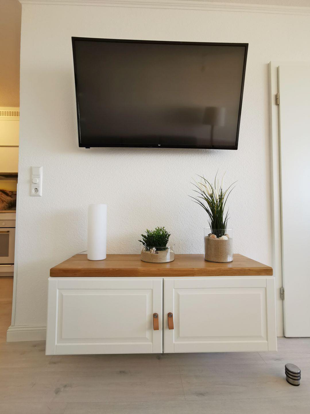 Durch den geänderten Grundriss der Wohnung befindet sich die helle und moderne Einbauküche mit einem wunderschönen Echtglas-Strandbild direkt im Eingangsbereich. Die Küche ist mit allem ausgestattet, was man zur Selbstversorgung benötigt - und noch einigem darüber hinaus: Induktions-Kochfeld, Backofen, Spülmaschine, großer Kühlschrank mit Gefrierfach, Besteck und Geschirr sowie alle gängigen Küchenutensilien.