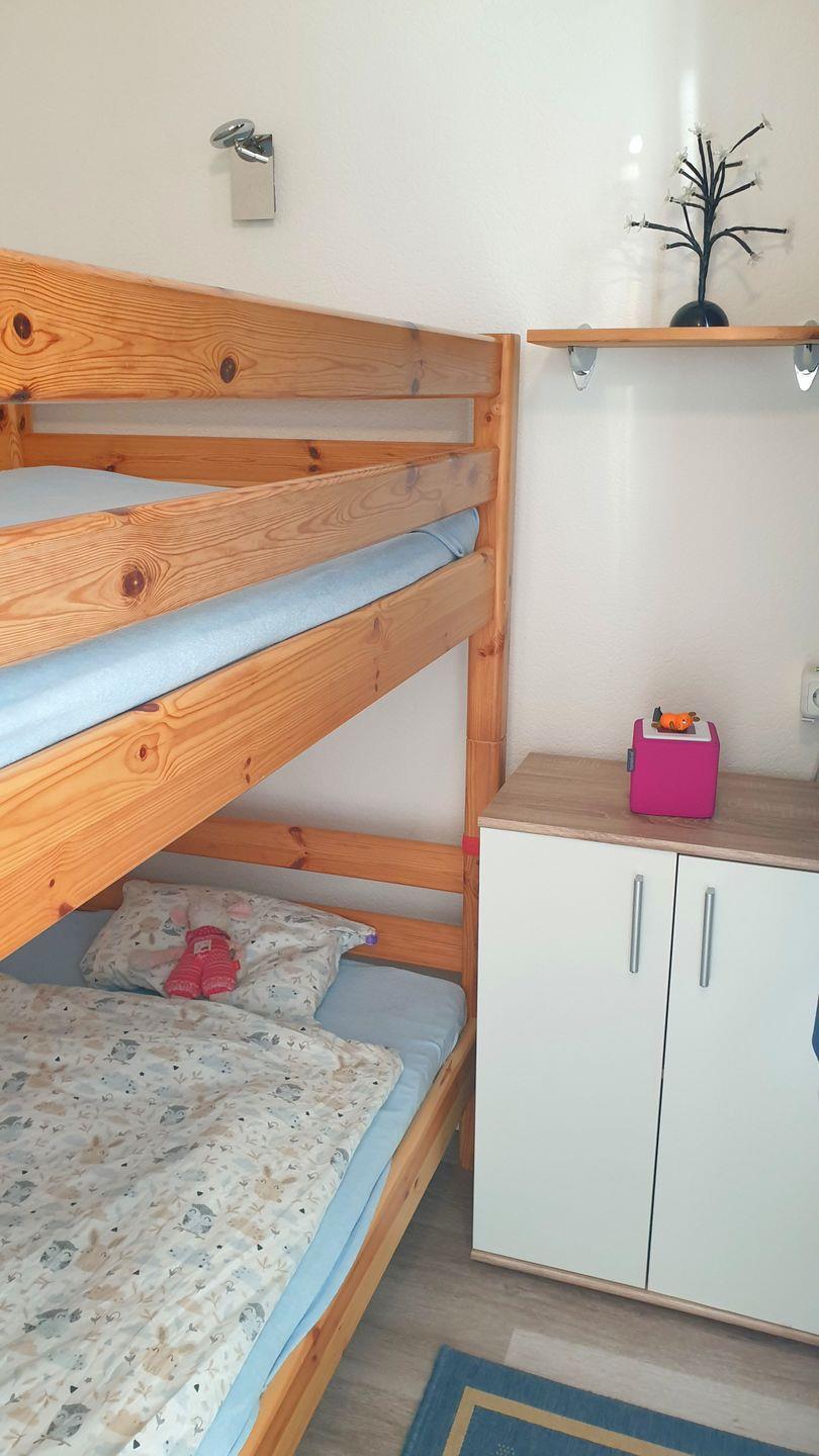 Schlafzimmer & Kinderzimmer: Das Schlafzimmer, abgeteilt durch eine Wand und Vorhänge, bietet ein komfortables Doppelbett. Ein separates Zimmer mit Etagenbett und Fenster steht für weitere Gäste bereit.