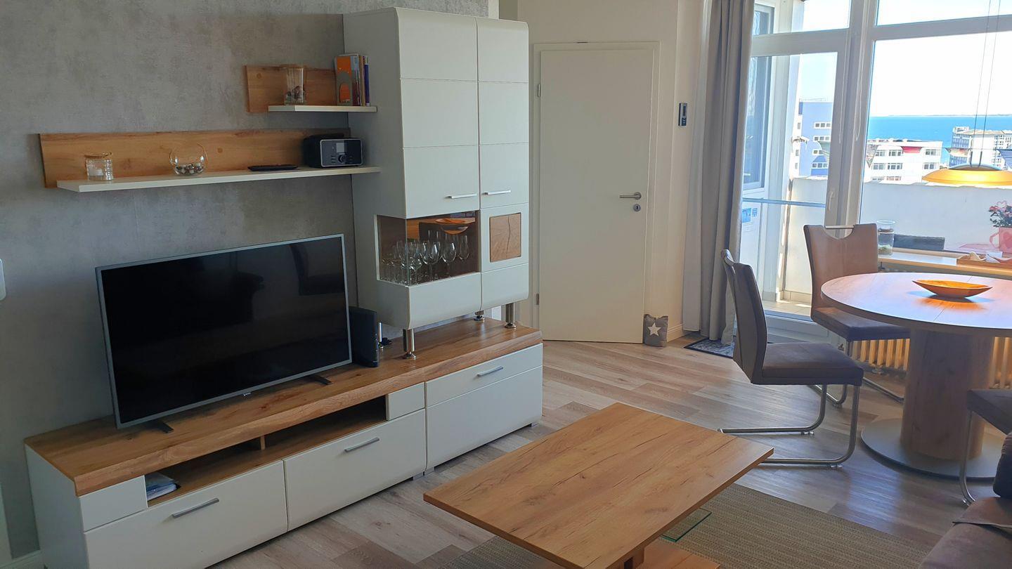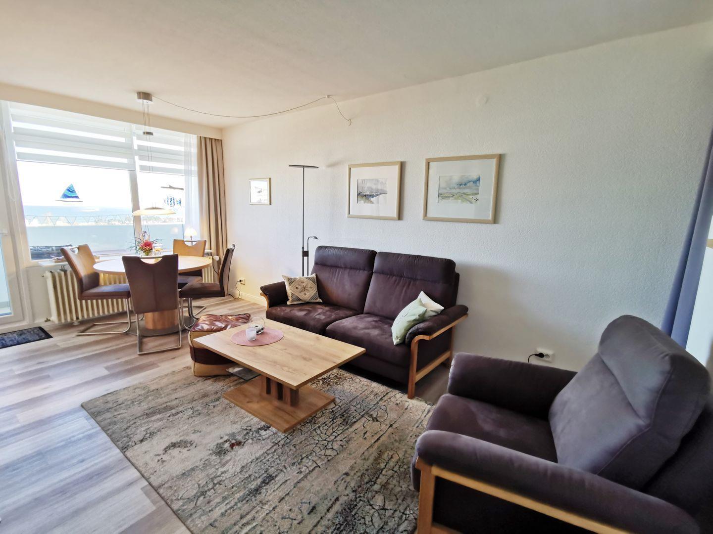 Wohnbereich: Der lichtdurchflutete Wohnbereich lädt mit einer gemütlichen Couch und einem Essbereich direkt am Fenster dazu ein, die atemberaubende Aussicht auf die Ostsee, Fehmarn und die Fehmarnsundbrücke zu genießen.