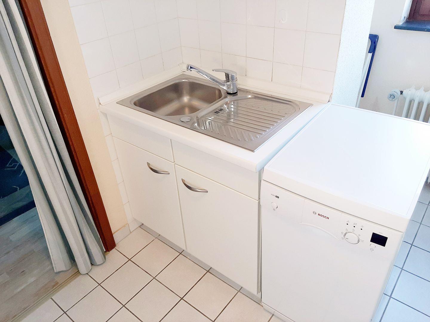 Die einfache Küchenzeile verfügt über einen Kühlschrank mit Gefrierfach, einen 4-Felder-Ceranherd sowie auch über eine Geschirrspülmaschine und eine Waschmaschine.