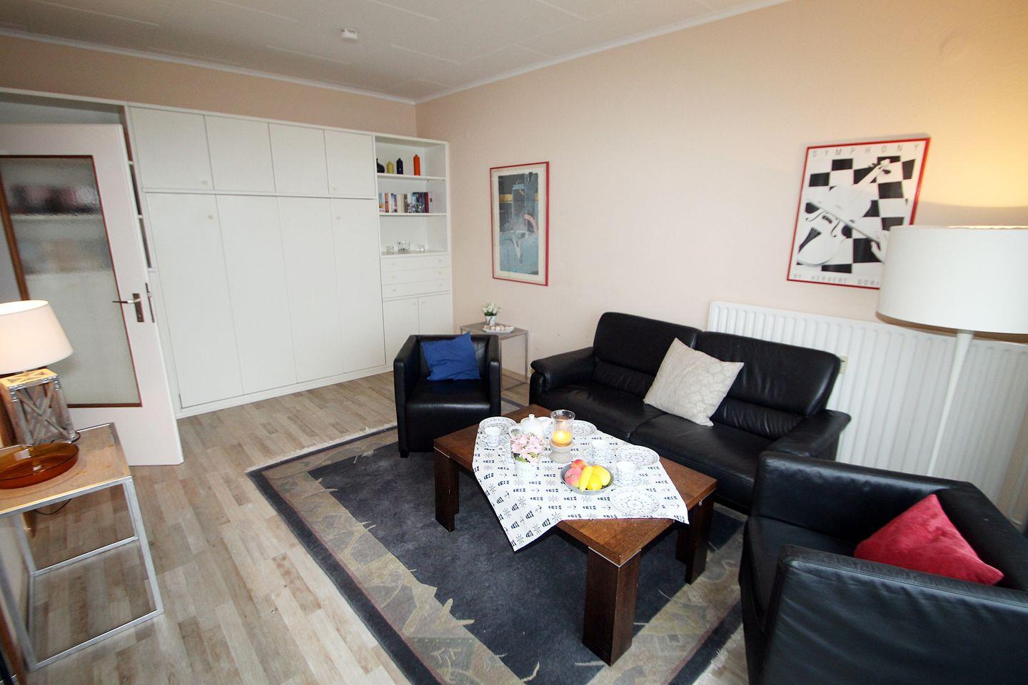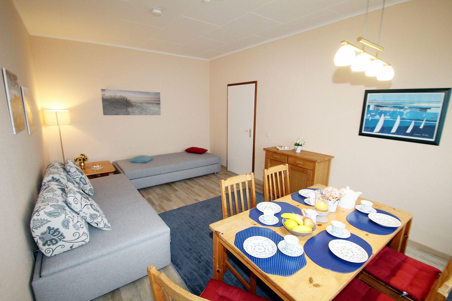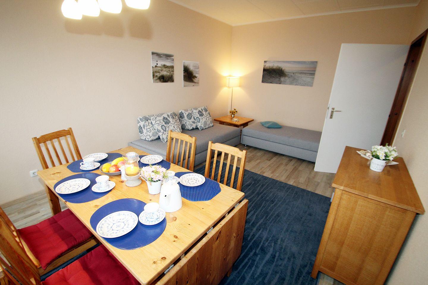 Das gemütliche Wohn-Esszimmer verfügt über eine bequeme Couchgarnitur mit 2 Sesseln sowie einem Schrankbett und einem Flachbild-TV.