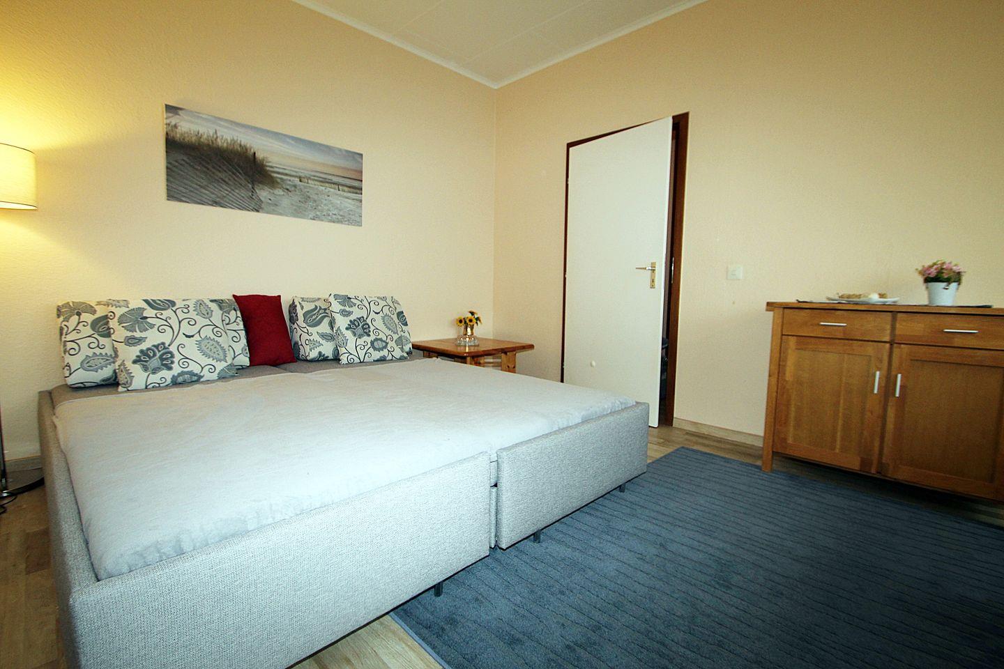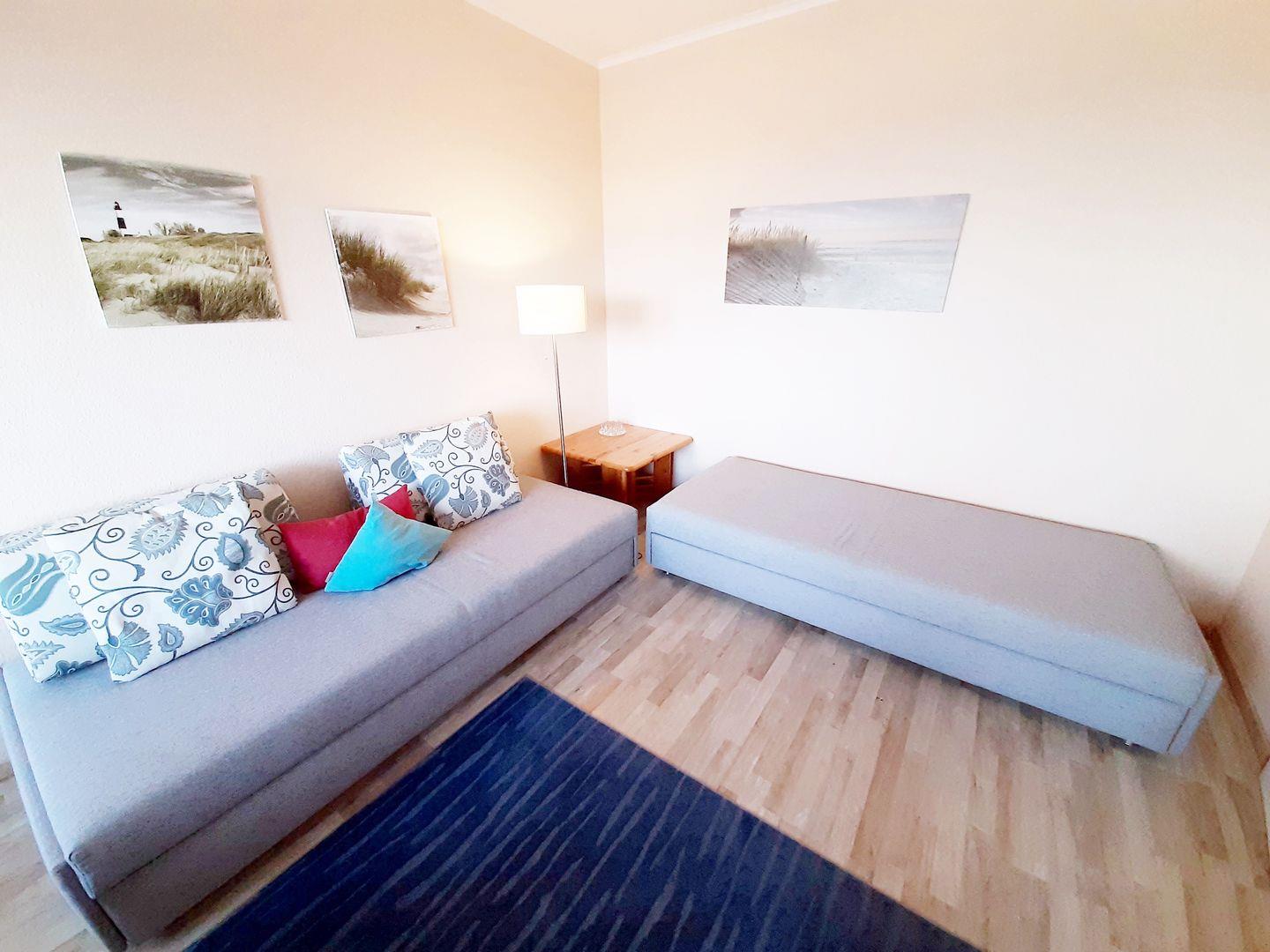 In einem weiteren, separaten Zimmer befinden sich zwei Einzel-Schlafcouchen, die gerne zusammengestellt werden können, sowie ein schöner Essbereich direkt am Fenster.