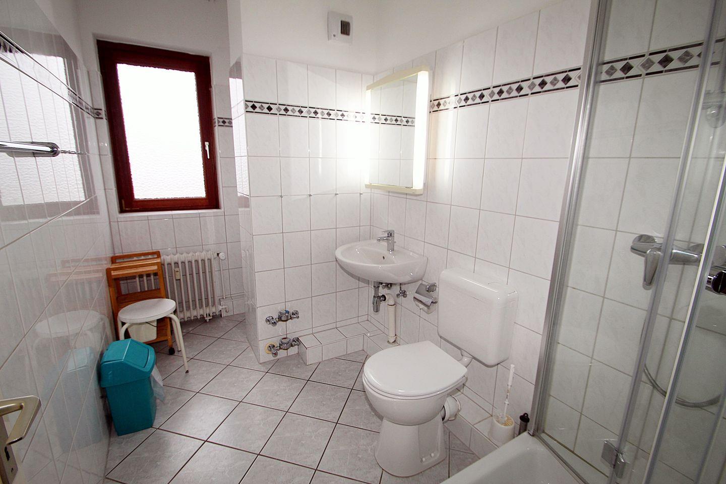 Das Badezimmer mit Fenster ist mit WC und Duschkabine sowie einem Spiegelschrank ausgestattet.