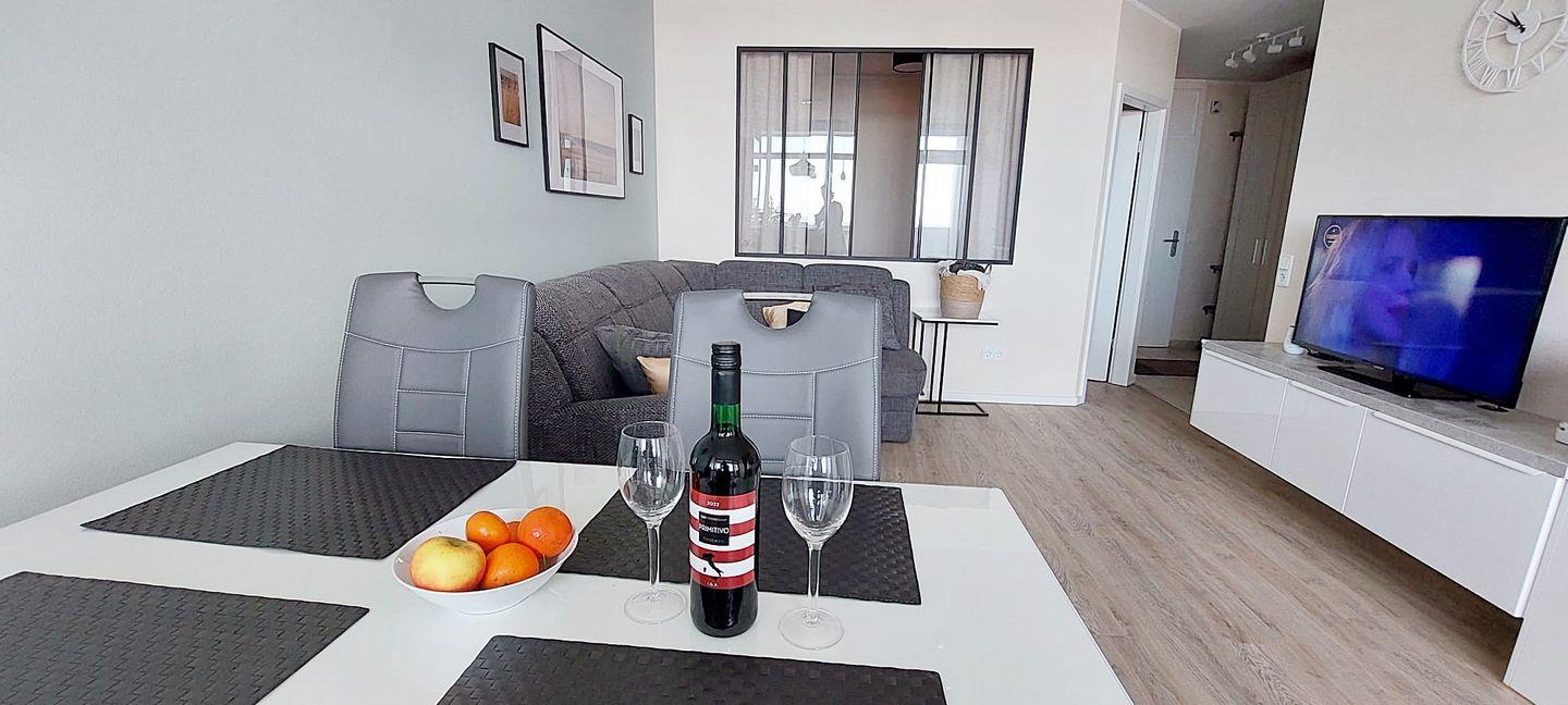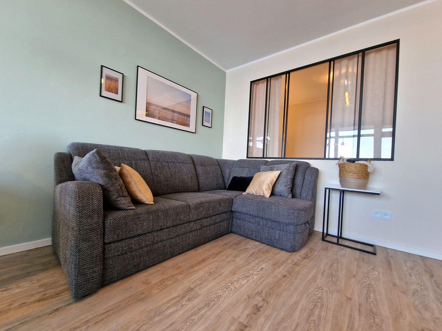 Als Sitzgelegenheiten steht eine gemütliche Couchgarnitur, welche auch als Schlafcouch genutzt werden kann, sowie ein Essbereich und ein kleiner Tresen mit 2 Barhockern, zur Verfügung - von hier aus genießen Sie den direkten und traumhaften Blick auf die Ostsee. Auch ein großer Flachbild-TV (43 Zoll) ist hier vorhanden.
