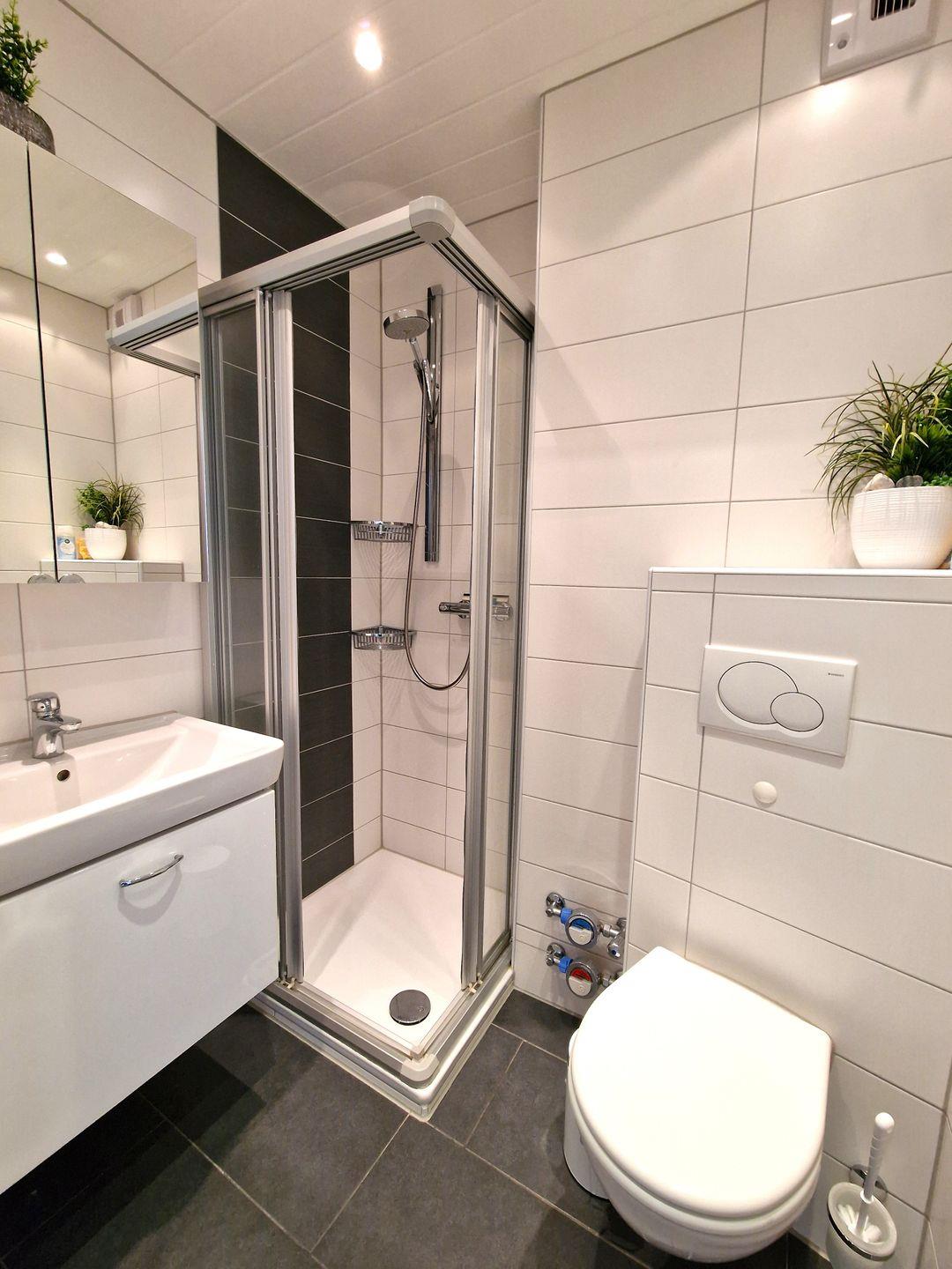 Im hellen Badezimmer mit Duschkabine und einem WC erwarten die Gäste ebenfalls kleine Annehmlichkeiten, wie z. B. ein moderner Handtuchheizkörper.