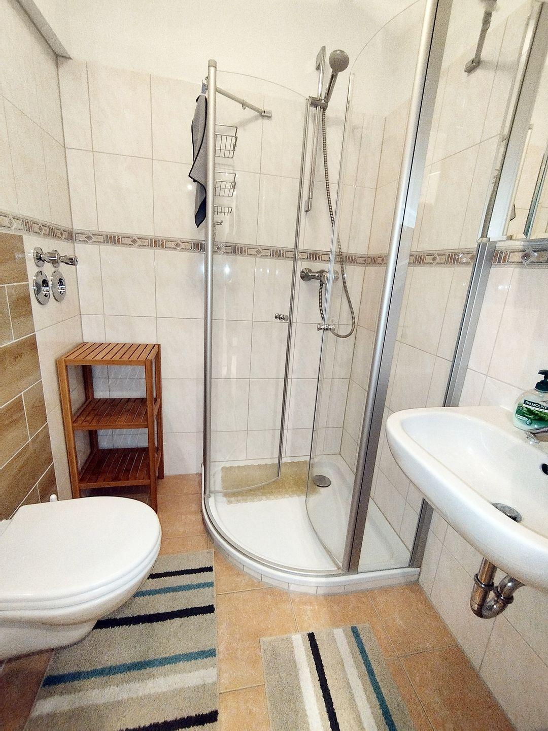 Das Badezimmer verfügt über eine Duschkabine, Waschbecken und ein WC.