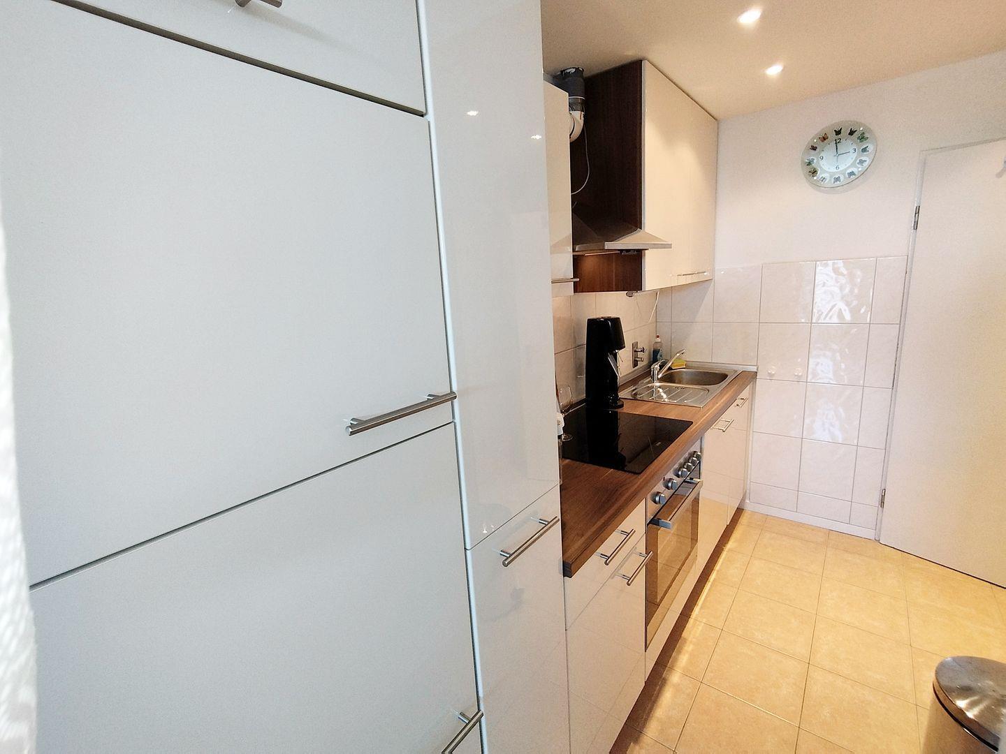 Die Küchenzeile ist mit einem Backofen, Ceranfeld, einer Spülmaschine sowie allen gängigen Küchenutensilien ausgestattet.