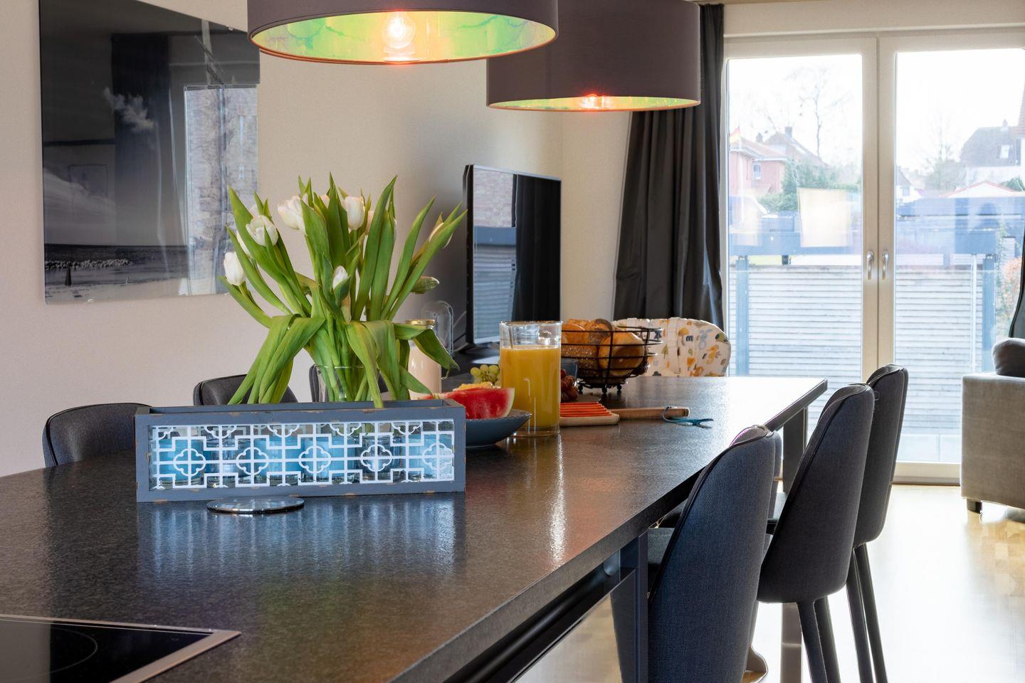 Freuen Sie sich im Erdgeschoss auf einen hellen Wohnbereich mit einem Essbereich und einer voll ausgestatteten Küche mit einer 3,50m langen Kochinsel. Das Gäste-WC, die Garderobe im Eingangsbereich und der Waschraum runden den unteren Bereich ab.