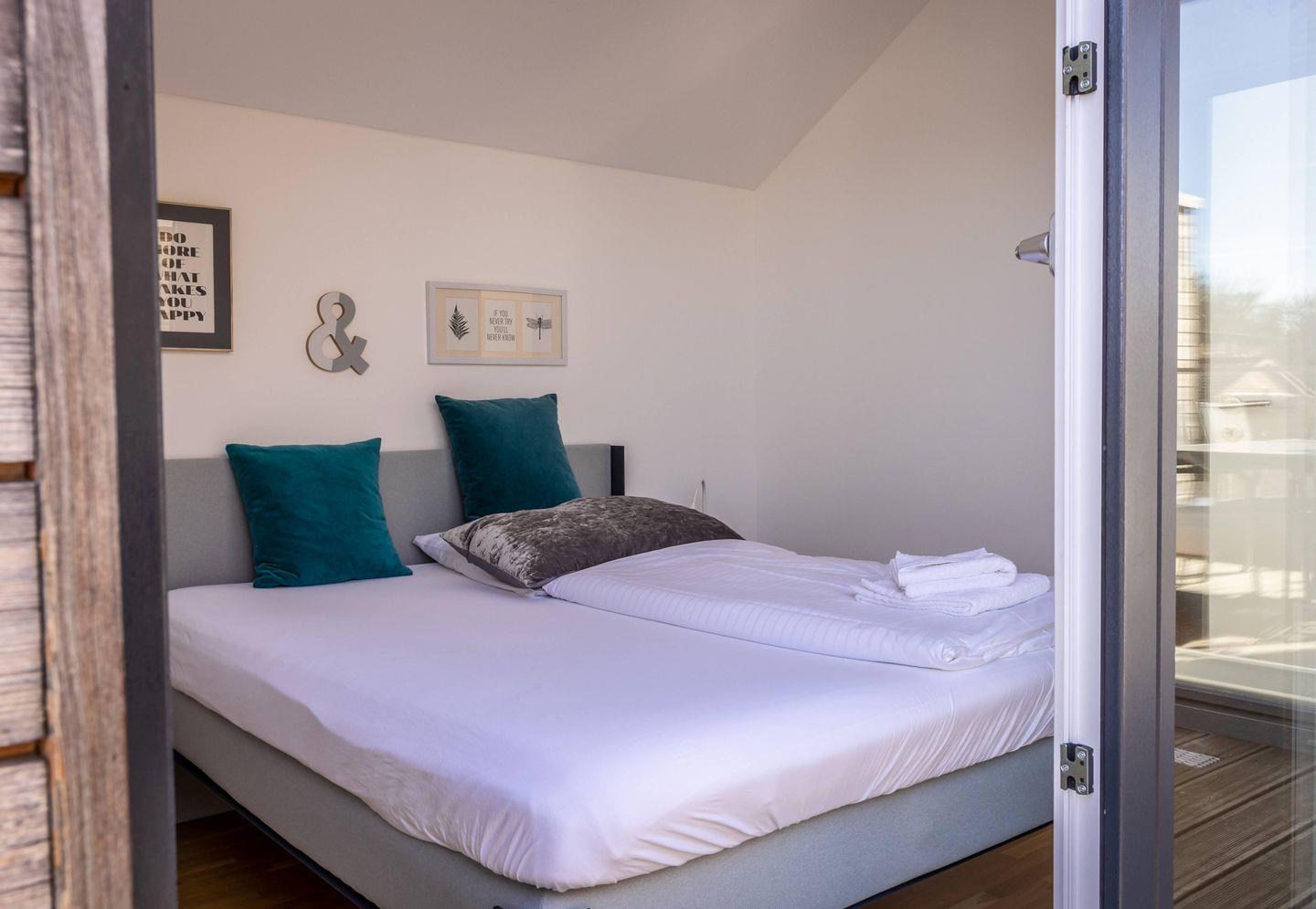 Im oberen Bereich der Unterkunft befinden sich die zwei Schlafzimmer. Das eine Schlafzimmer hat ein großes Doppelbett (2,00 x 2,00m), das zweite hat ein Doppelbett (1,40 x 2,00m). Ein Babybett sowie ein Hochstuhl stehen Ihnen kostenfrei zur Verfügung. Ergänzt wird das Obergeschoss durch das moderne Badezimmer mit Dusche und Badewanne.