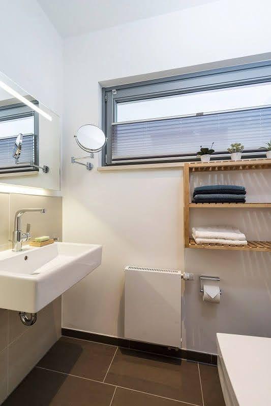 Im Obergeschoss befinden sich drei Schlafzimmer: eines mit einem großen Doppelbett, ein weiteres mit einem Doppelbett und das dritte mit zwei Einzelbetten. Das moderne Badezimmer mit Badewanne und separater Regendusche befindet sich ebenfalls im Obergeschoss. Ein Gäste-WC befindet sich im Erdgeschoss.