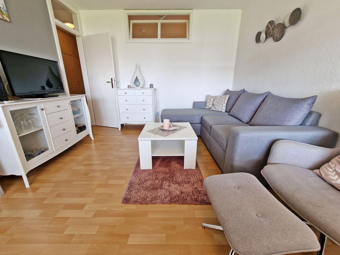 Der helle Wohnbereich ist mit einer bequemen Couchgarnitur, welche auch als Schlafgelegenheit genutzt werden kann, einer gemütlichen Sitzecke direkt am Fenster sowie einem Sideboard mit Flachbild-TV ausgestattet. Die offene Küche bietet alles, was man benötigt - inkl. Backofen.