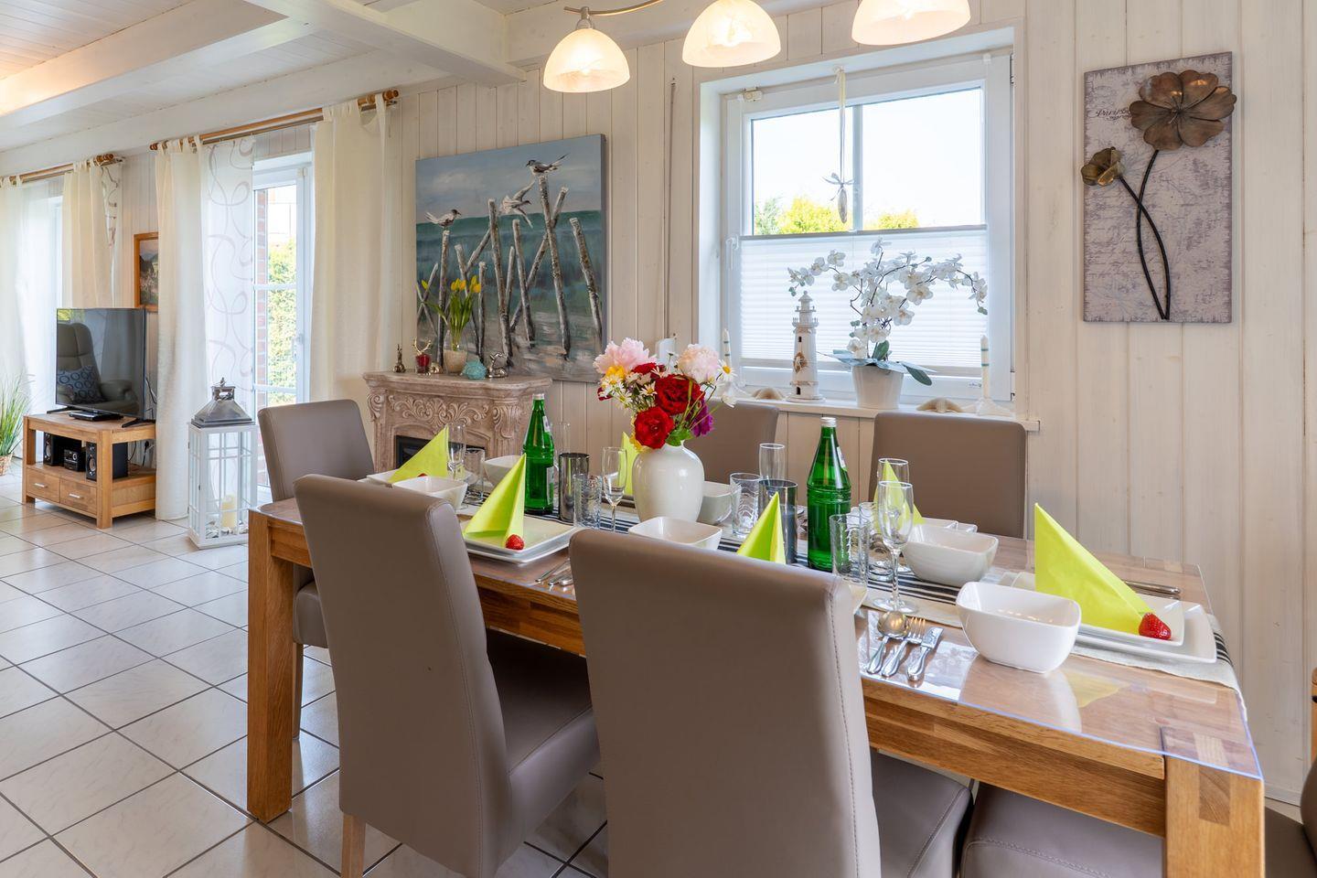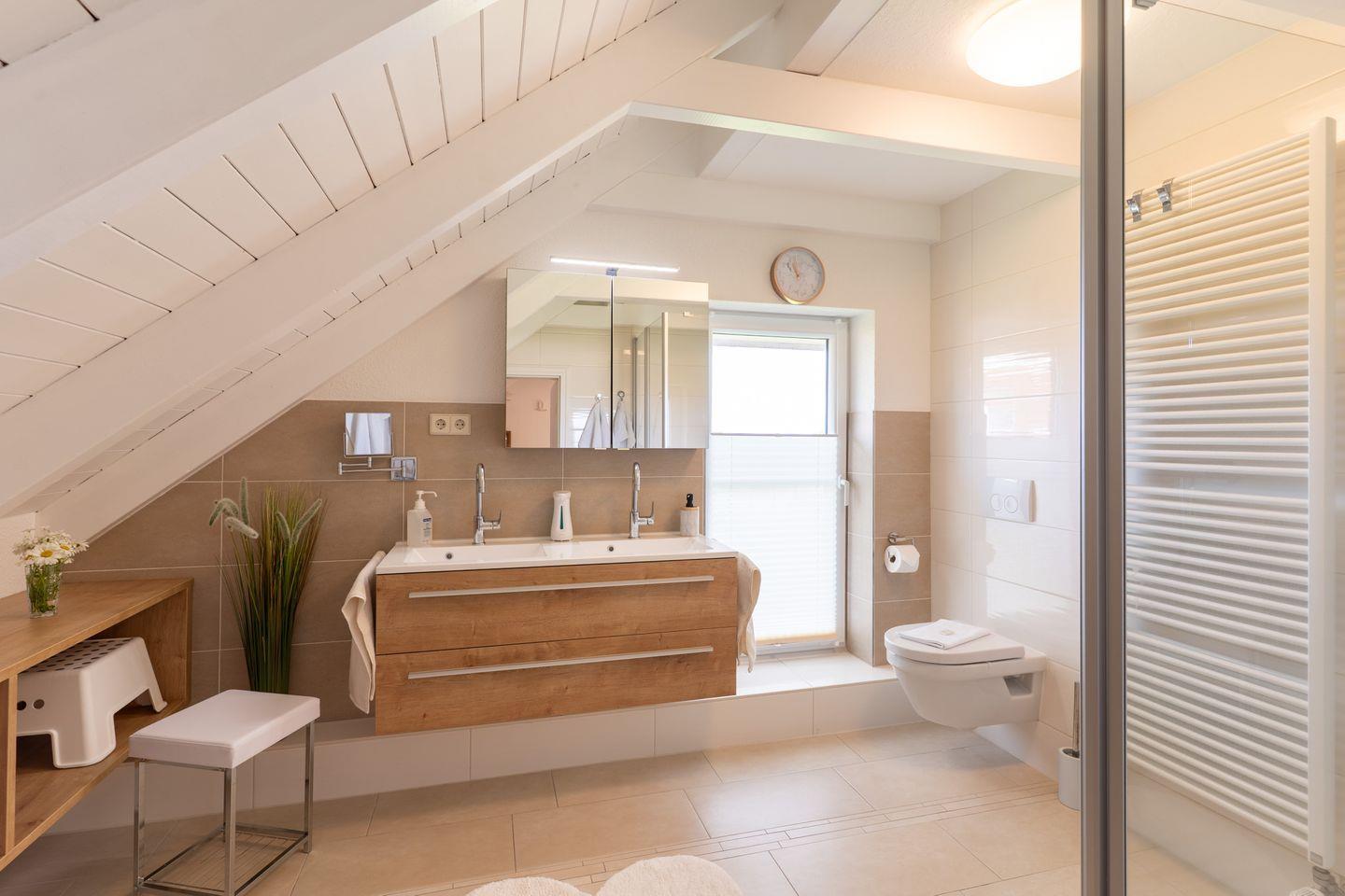Auf zwei Etagen erwarten Sie insgesamt 4 Zimmer, darunter 3 gemütliche Schlafzimmer inkl. Flachbild-TV (1 Schlafzimmer im EG, 2 Schlafzimmer im 1. OG) und 2 gut ausgestattete Badezimmer jeweils mit modernen Glasduschkabinen. Die offene Küche, die direkt in den einladenden Wohnbereich übergeht, verfügt über alle Annehmlichkeiten wie einen Herd, Backofen, Spülmaschine und einen Kaffeevollautomaten. Hier können Sie mit Ihren Lieben köstliche Mahlzeiten zubereiten und am großen Esstisch gemeinsam genießen.