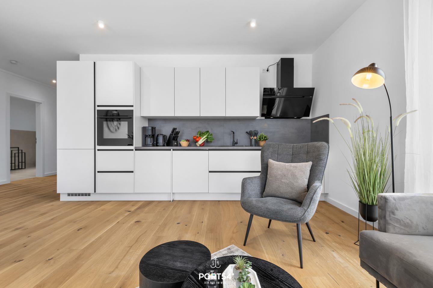 Die Wohnung verfügt über zwei gemütliche Schlafzimmer, die mit hochwertigen Parkettböden ausgestattet sind und eine erholsame Nachtruhe garantieren. Das geräumige Wohnzimmer besticht durch ein modernes Design und ist mit drei Fernsehern ausgestattet, sodass Sie nach einem Tag am Strand gemütlich einen Filmabend genießen können. Der offene Wohn- und Essbereich lädt zu gemeinsamen Mahlzeiten ein und die komplett ausgestattete Küche lässt keine Wünsche offen. Hier finden Sie alles, was Sie benötigen – vom Cerankochfeld über einen Elektrobackofen bis hin zu einer Spülmaschine. Damit wird das Kochen zum Vergnügen!