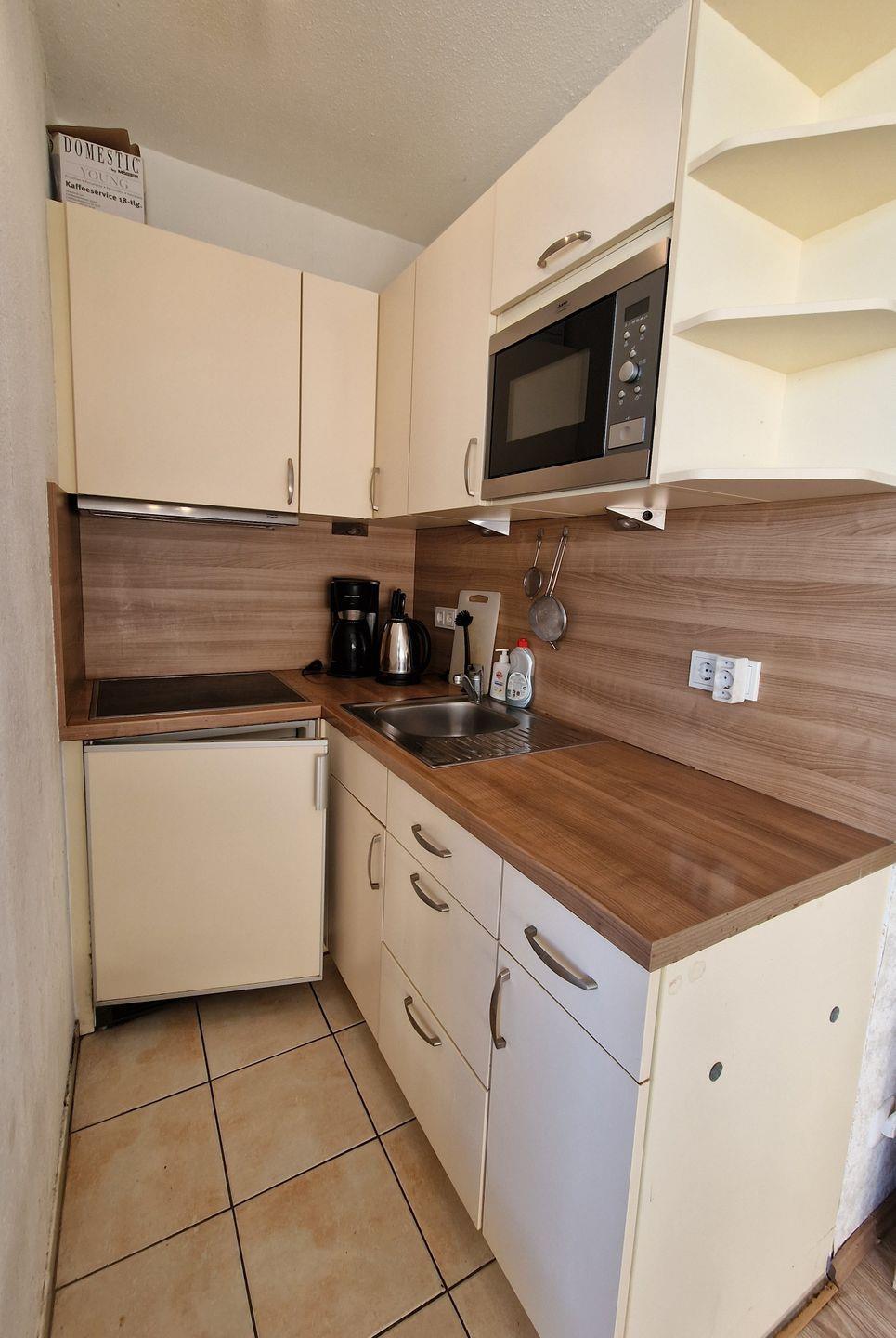 Die Kochnische ist mit allen notwendigen Küchenutensilien, einem Herd, einem Kühlschrank mit Gefrierfach, einer Mikrowelle sowie einer Kaffeemaschine und einem Wasserkocher ausgestattet. Der Esstisch bietet genügend Platz, um gemeinsam zu speisen und die Erlebnisse des Tages Revue passieren zu lassen.