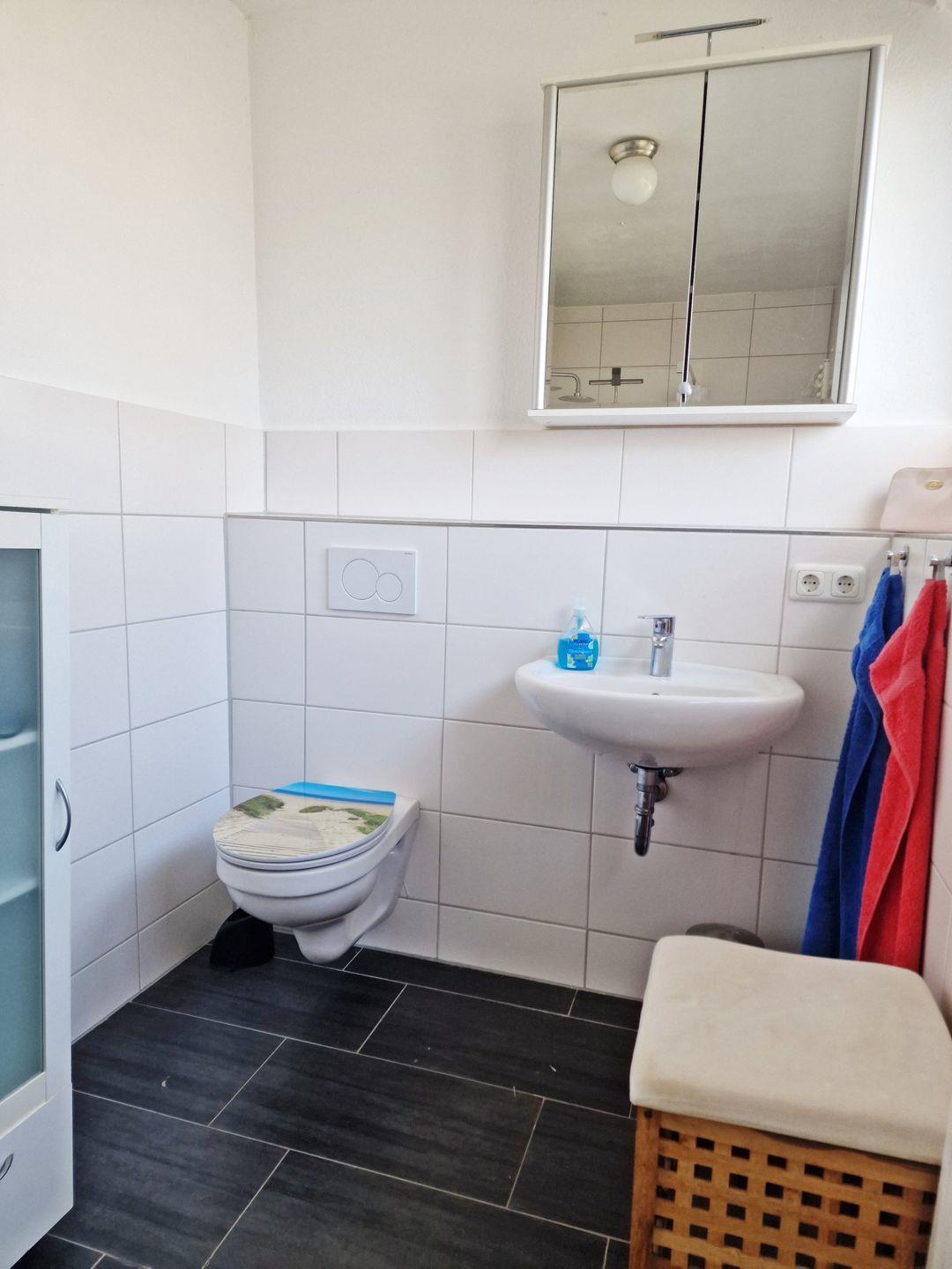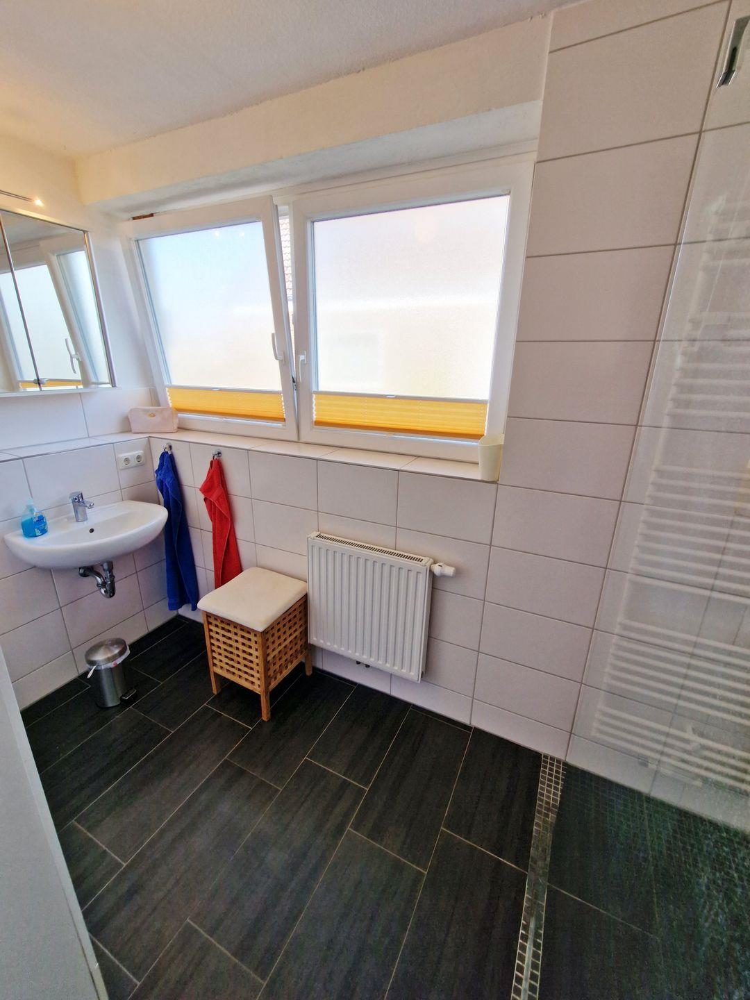Das Badezimmer ist mit einer bodengleichen Dusche und modernen Sanitäranlagen ausgestattet. Hier finden Sie alles, was Sie für Ihr Wohlbefinden benötigen. Ein Bad mit Spiegel, Waschbecken und WC rundet die luxuriöse Ausstattung ab.