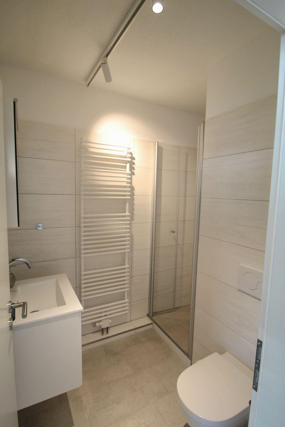 Das Badezimmer verfügt über eine bodengleiche Dusche, WC, Waschbecken und Spiegel. Warmes Wasser ist selbstverständlich vorhanden. Ein Rauchmelder sorgt für zusätzliche Sicherheit.
