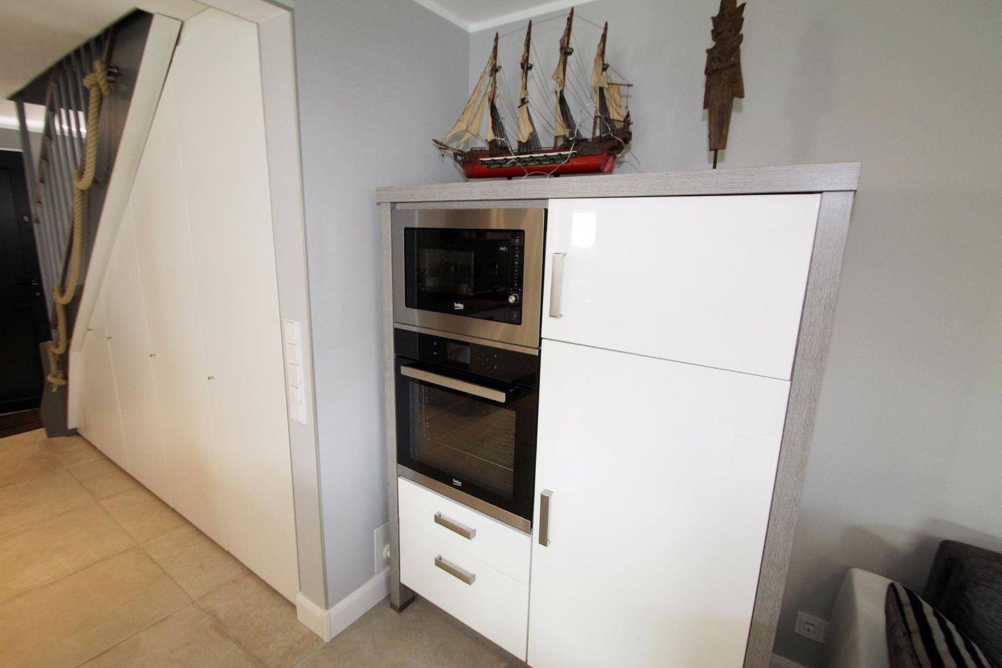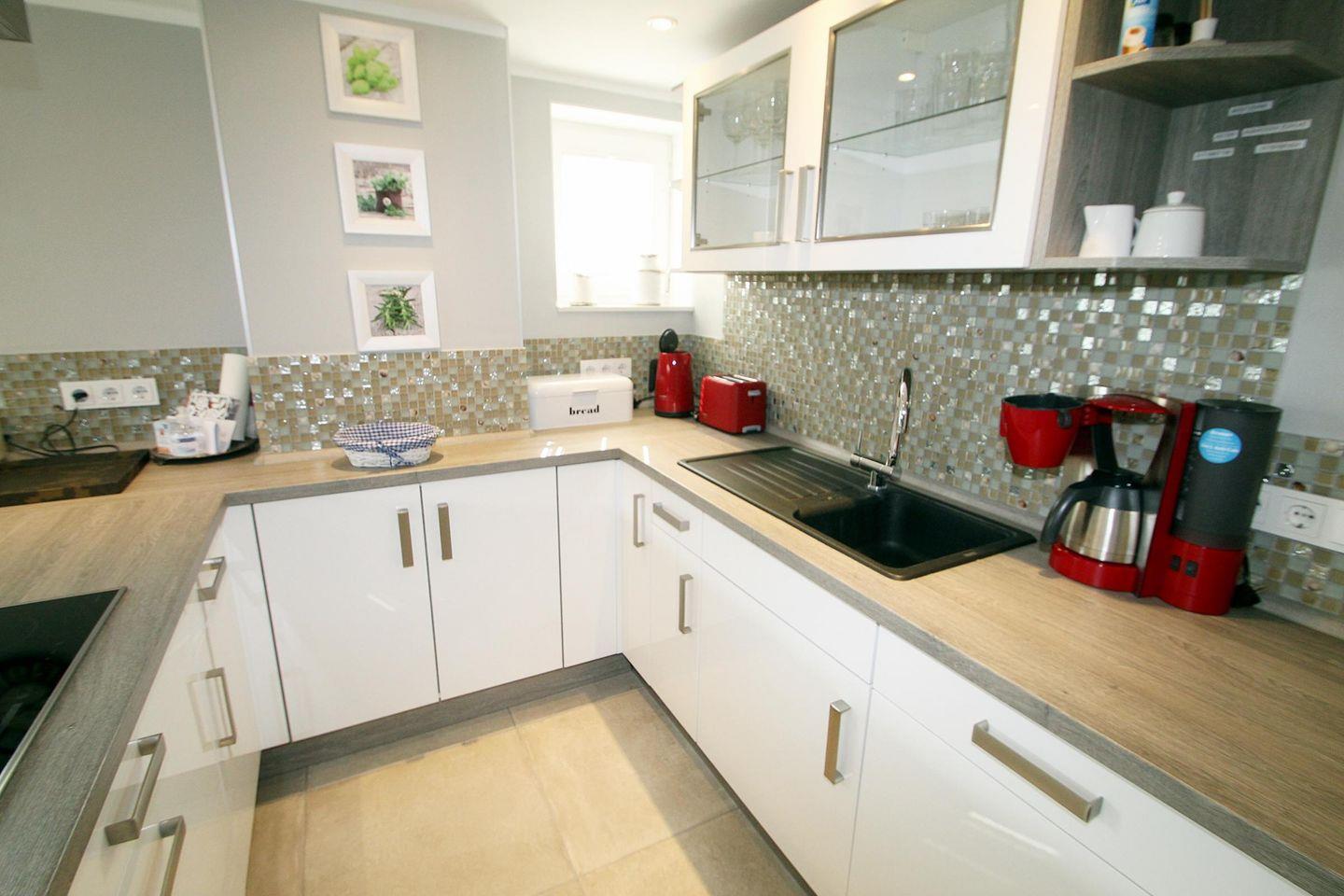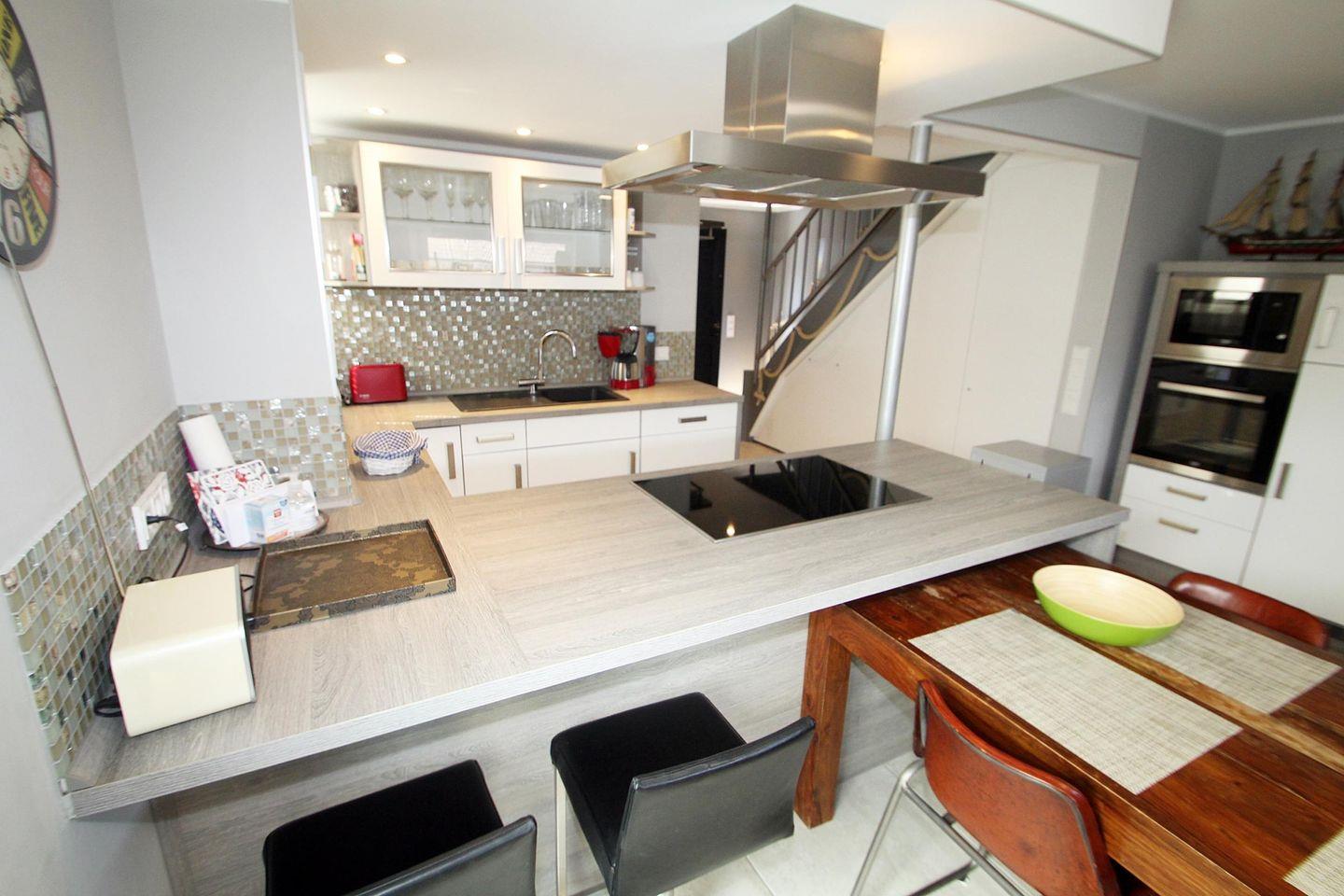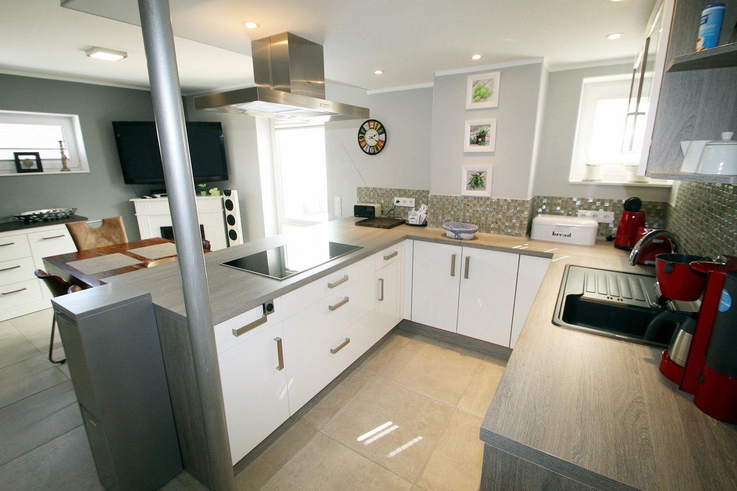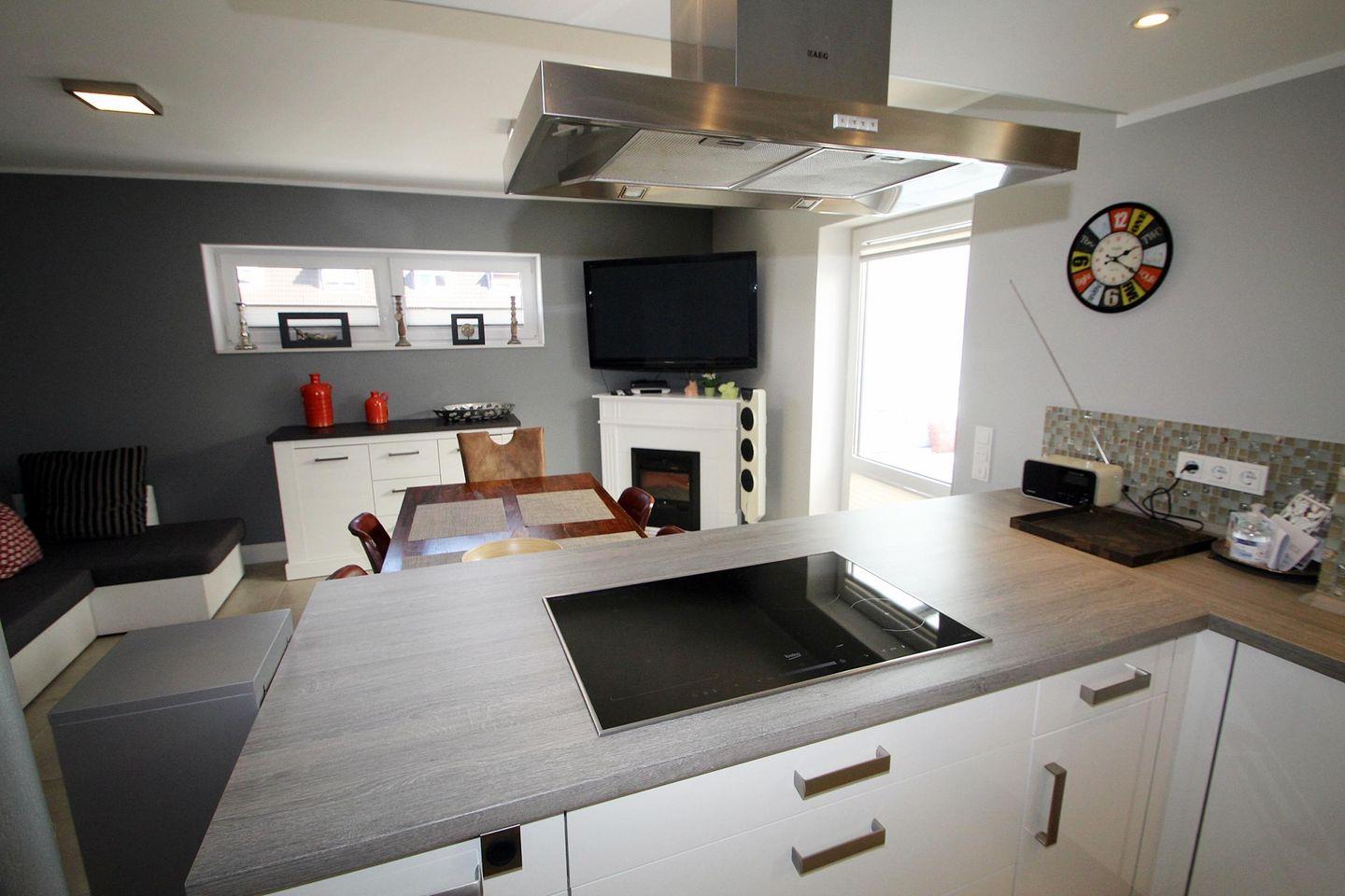 Stilvoll eingerichteter, heller und offener Wohn- und Kochbereich mit toller und voll ausgestatteter Hochglanz-Einbauküche mit Induktionsherd auf einer Kochinsel -mit Tresen-, digitalem Einbau-Hochbackofen, digitaler Einbau-Mikrowelle sowie Geschirrspülmaschine.
