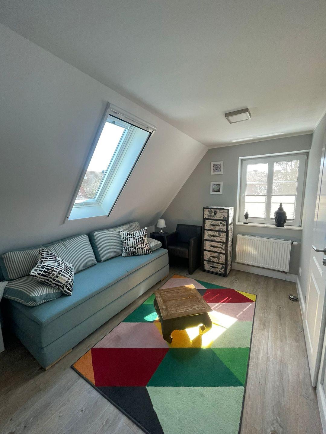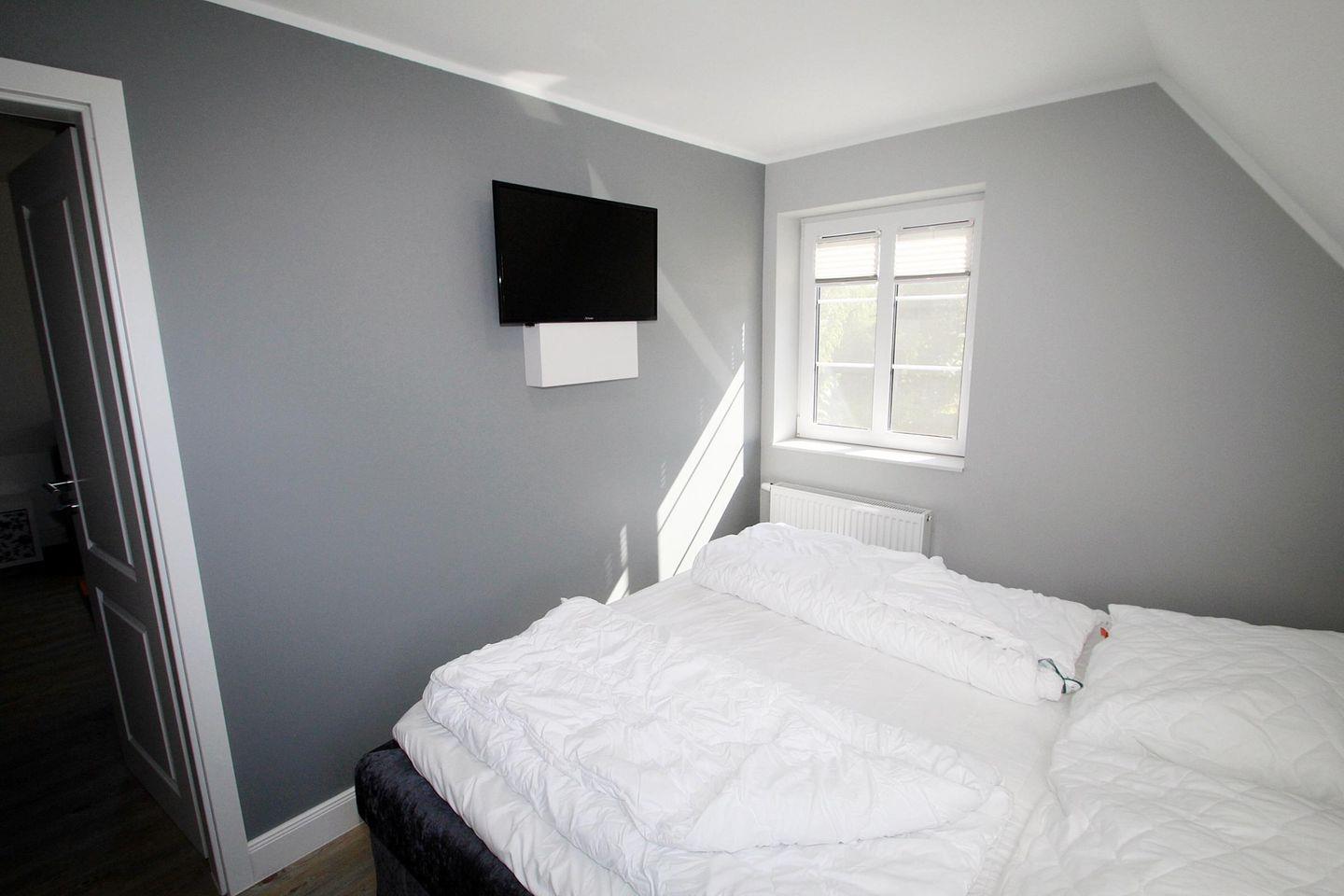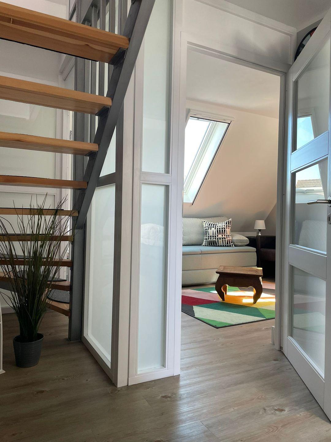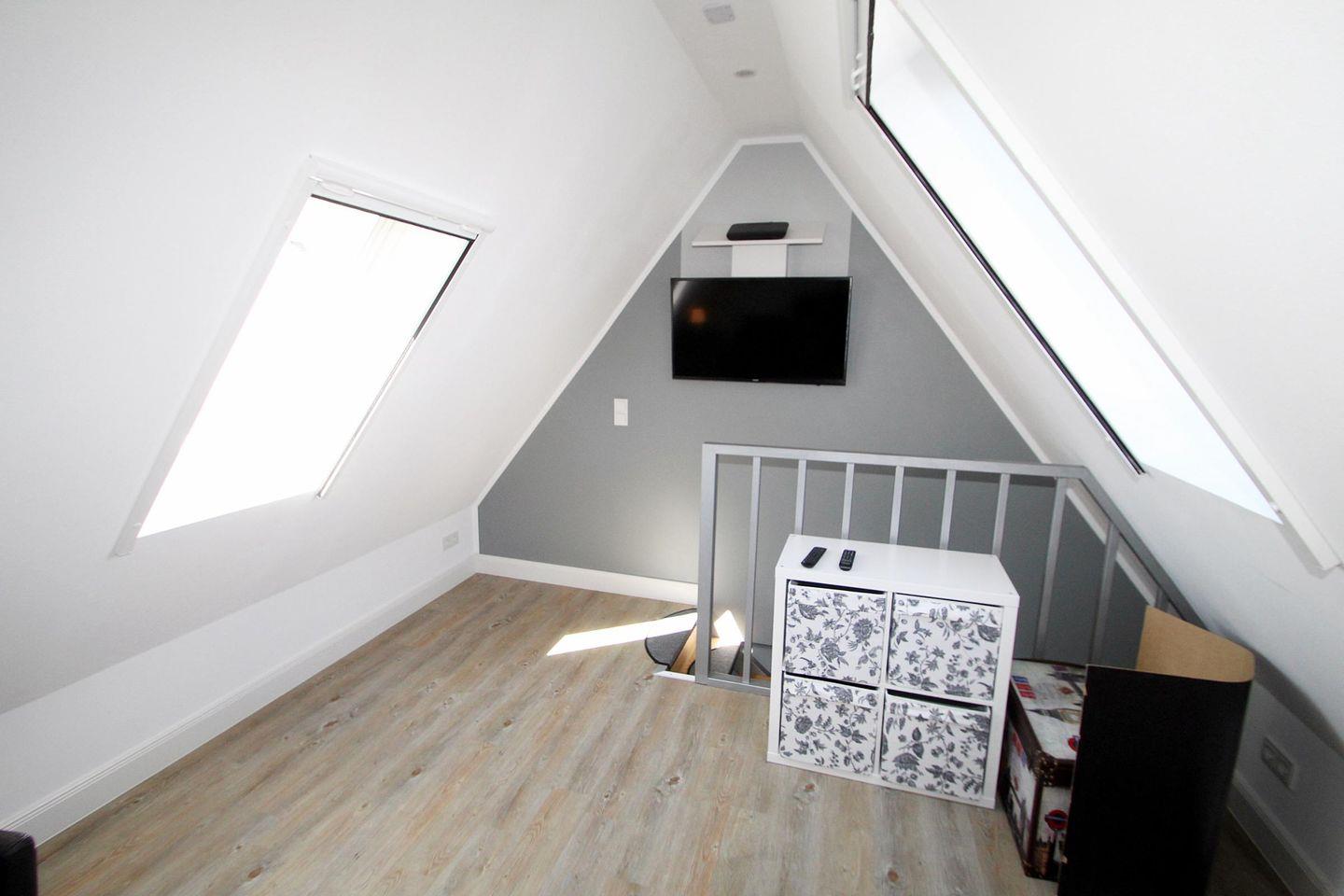Der offene Treppenaufgang führt in die erste Etage, wo Sie ein sep. Wohnraum mit Couchecke (auch als Schlafcouch für 2 Personen nutzbar) und Flachbild-TV erwartet. Von hier aus haben Sie Zugang zum weitern, sep. Schlafzimmer mit Doppelbett (eine Matratze 154 cm) und Flachbild-TV sowie einem Fenster zum Öffnen.