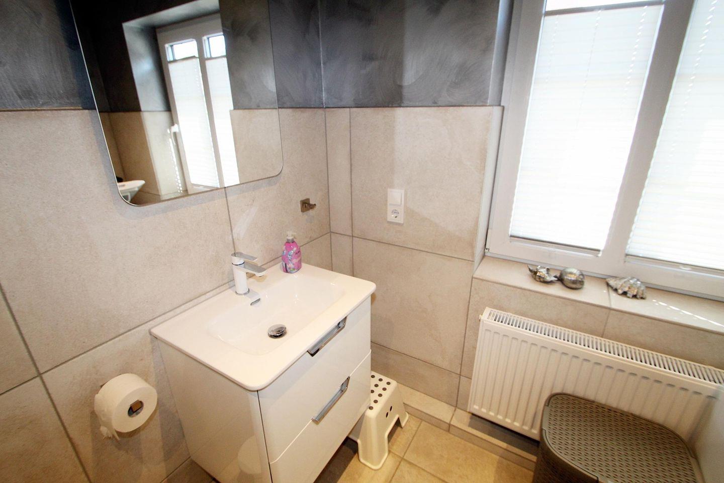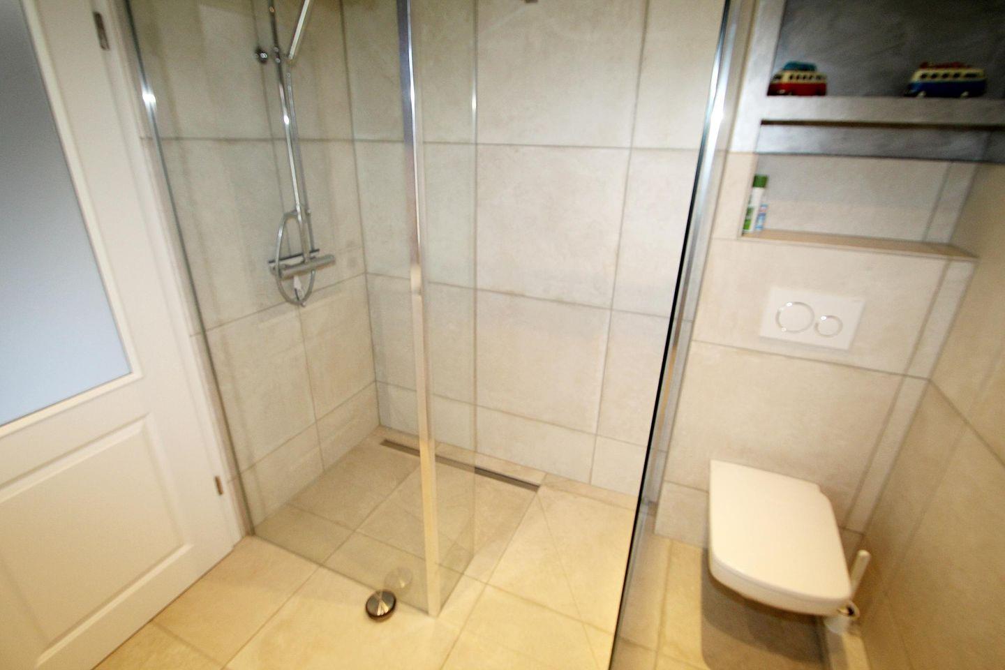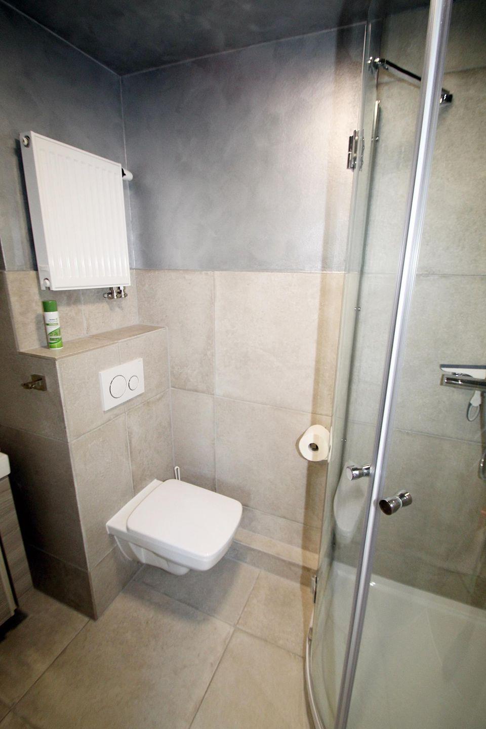 Das untere Badezimmer ist modern und exclusiv gestaltet und verfügt über eine große Glasduschkabine mit Bodenablauf (ohne Stufe), Hänge-WC und einem Waschbecken mit beleuchtetem Spiegel.