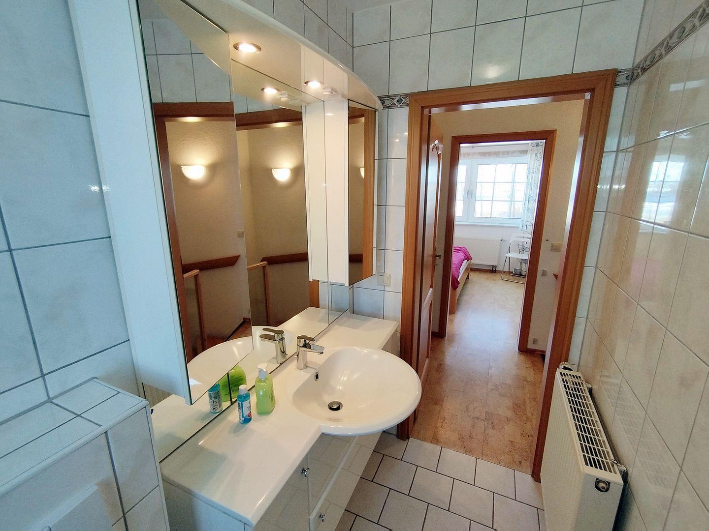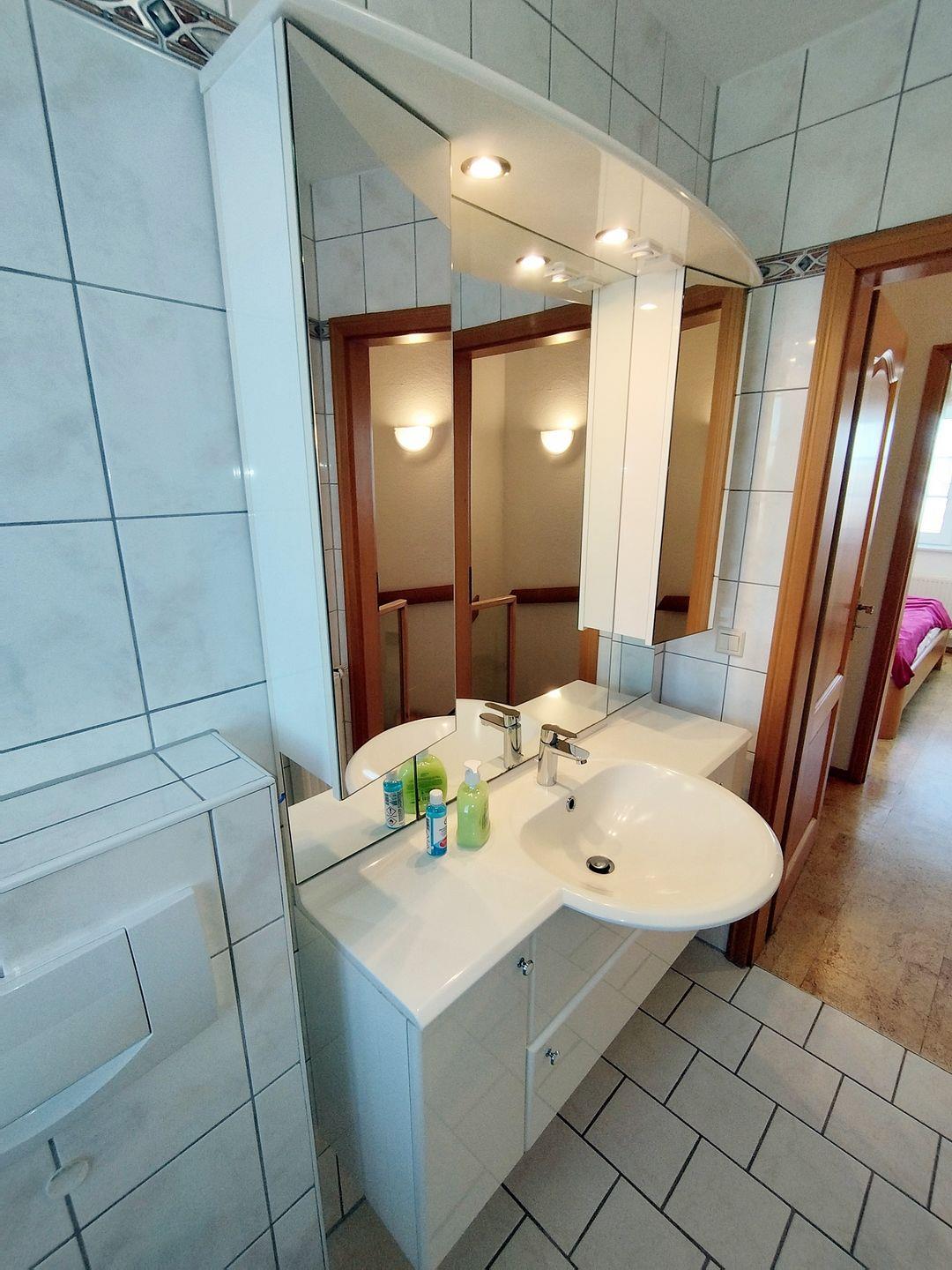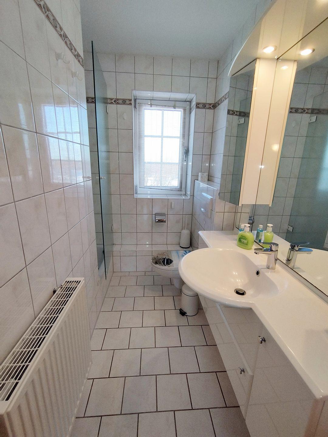 Das Duschbad wurde mit großem Spiegel- und Waschbeckenschrank, einer Nischendusche mit Glasduschwandwand und WC ausgestattet.