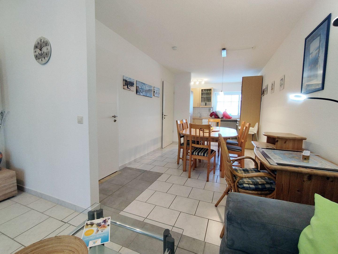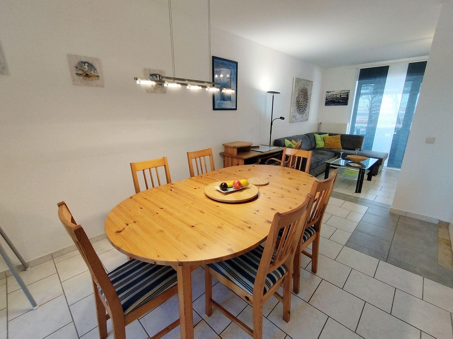 Die buchefarbene Einbauküche ist mit Ceranherd, Backofen, Geschirrspüler, Kühlschrank mit Gefrierfach, Microwelle, Geschirr und umfassenden Zubereitungsgeräten für Ihren Urlaub ausgestattet. Am großen Esstisch finden 6 Personen die Möglichkeit gemeinsame Mahlzeiten oder Spieleabende zu genießen. Ein zusätzlicher Kinderhochstuhl steht bereit.