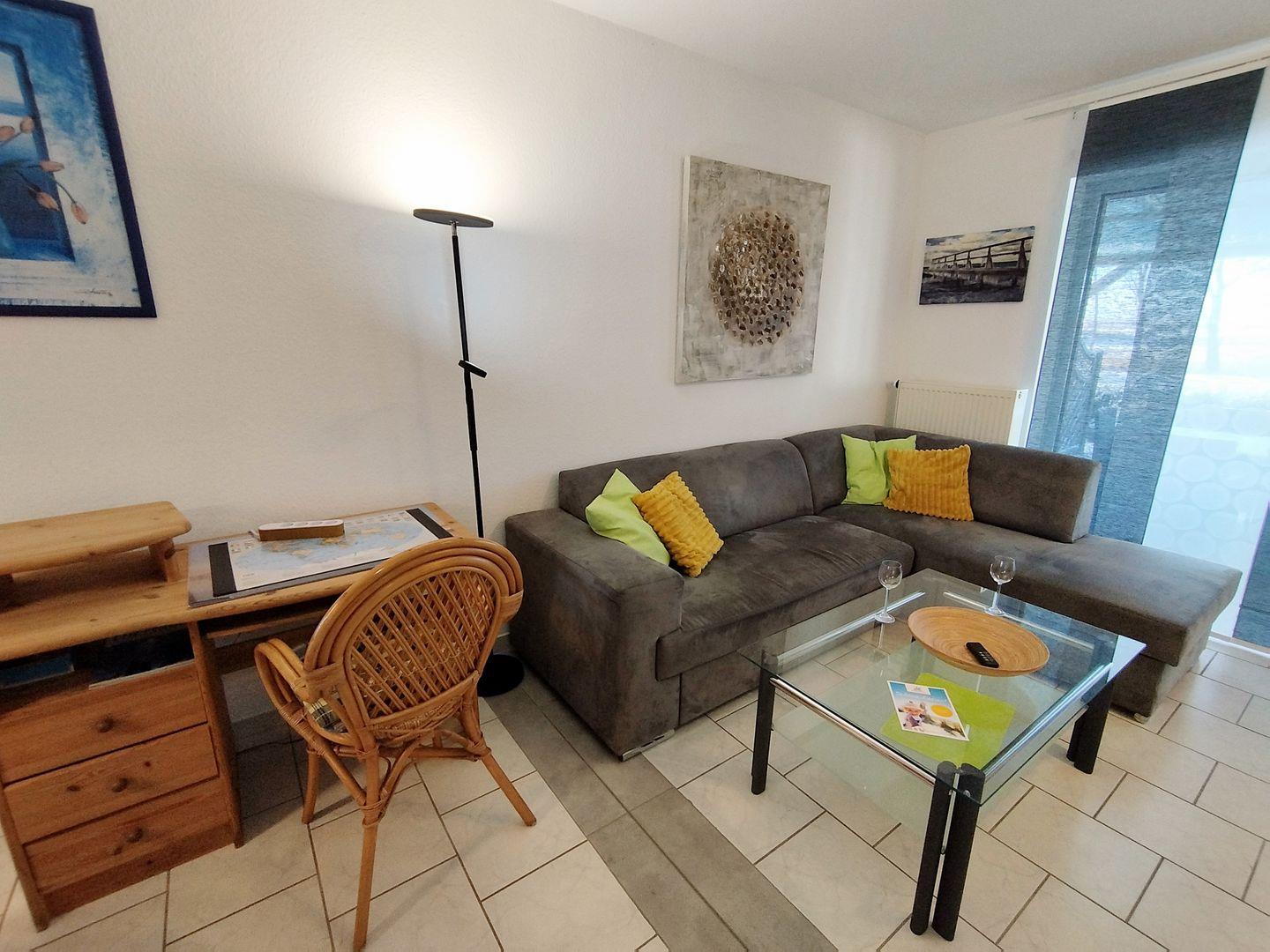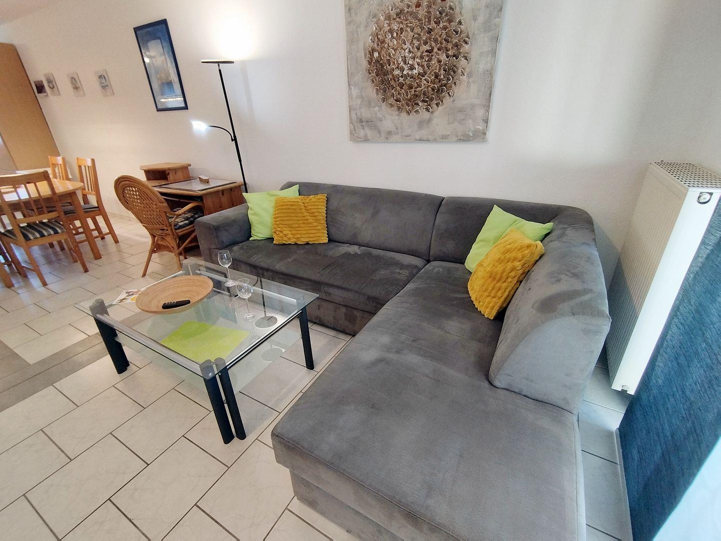 Im Wohnzimmer wartet eine gemütliche L-Couch darauf der ganzen Familie Platz zu bieten. Eine Kompaktanlage, W-Lan und ein TV-Gerät stehen bei Bedarf für Ihre Unterhaltung zur Verfügung. Auf dieser Etage finden Sie (zusätzlich zum Duschbad oben) ein Gäste-WC.