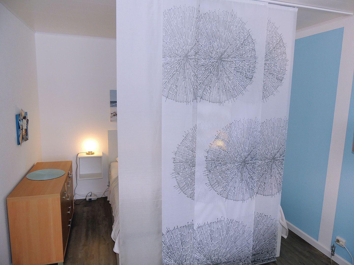- Doppelbett im hinteren Bereich, abgeteilt durch Flächenvorhänge